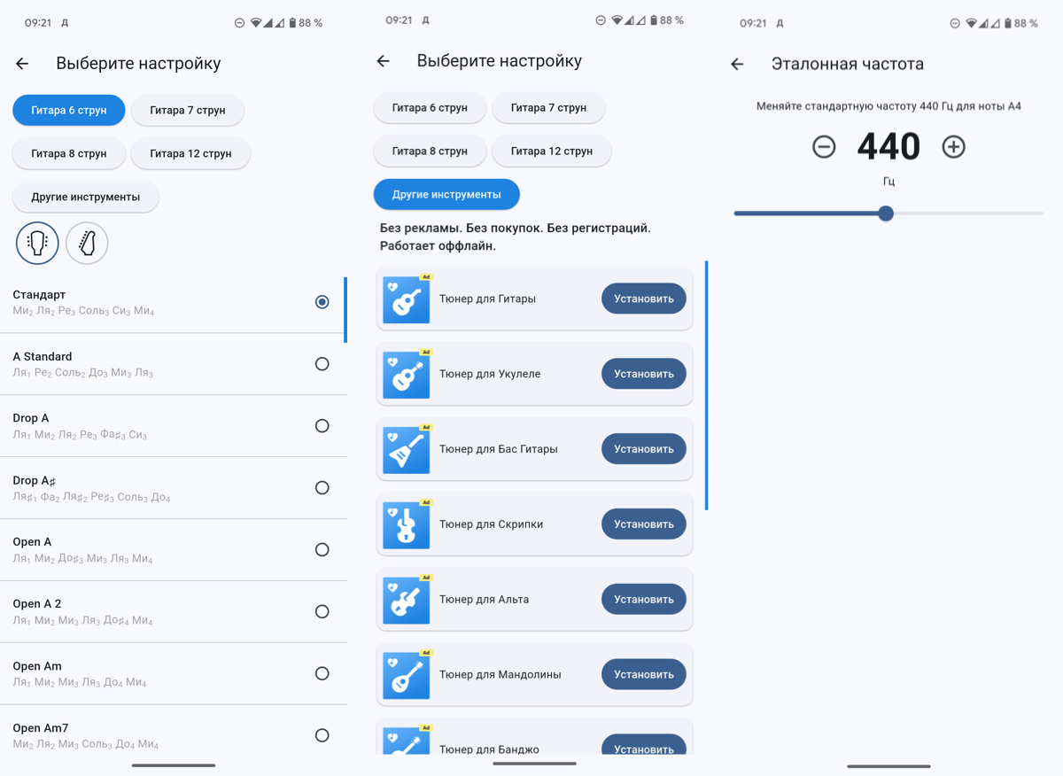 При необходимости вы можете перейти в настройки и выбрать конкретный тип гитары и её настройки, а также выбрать частоту A4.