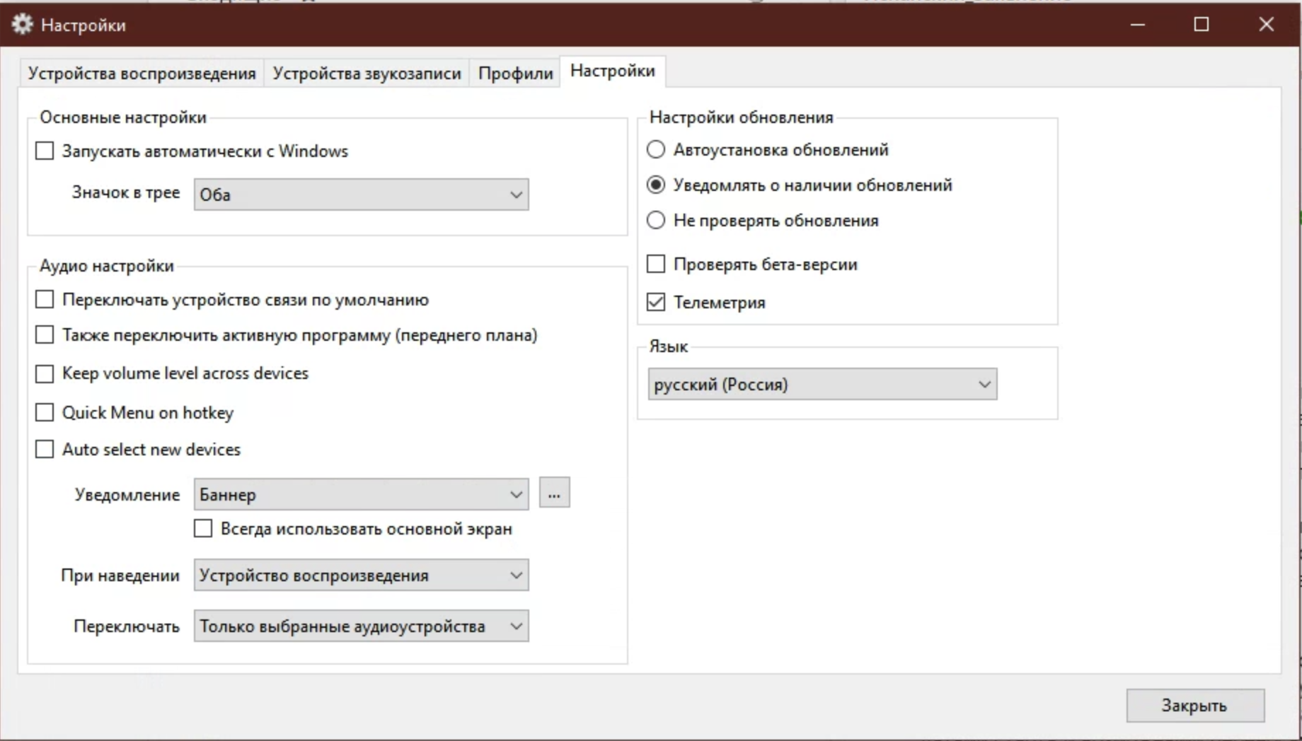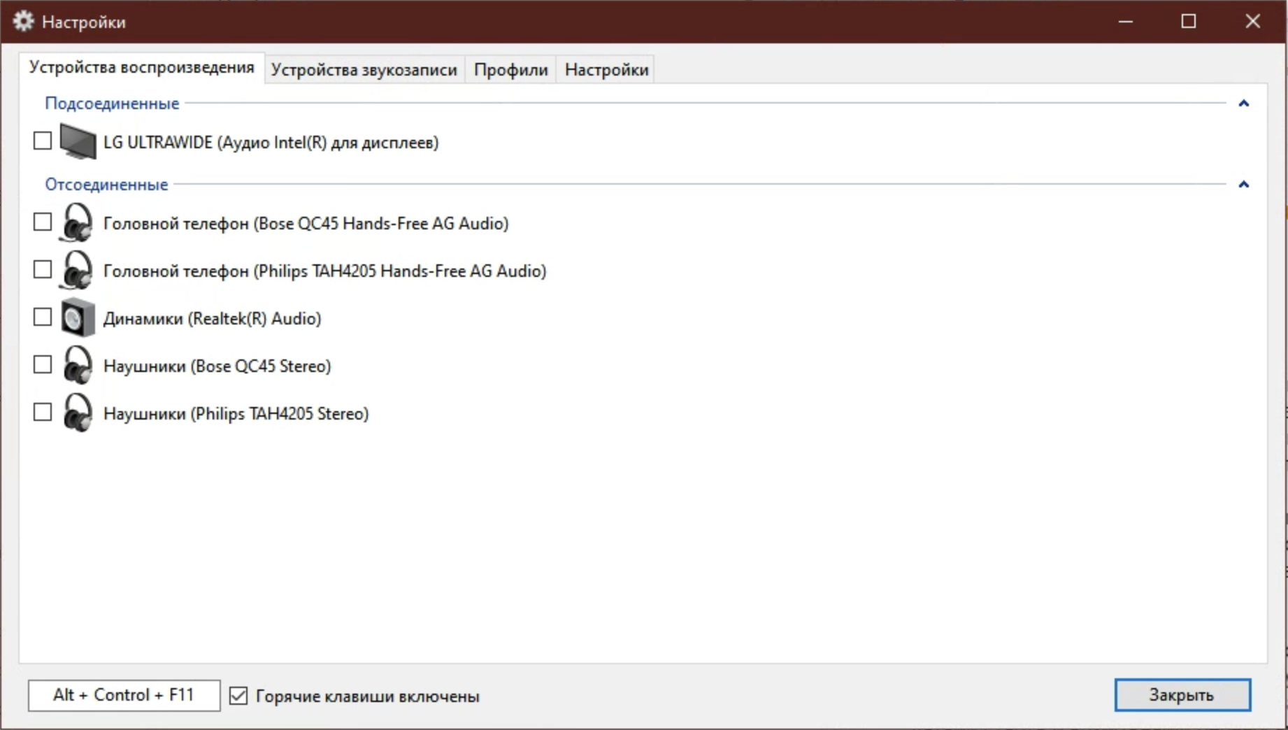 Сразу после установки утилита отобразит текущие аудиоустройства, включая отключённые. Вы можете поставить галочку у тех, между которыми вы хотите переключаться. При этом вы можете настроить переключение как для устройств воспроизведения, так и записи.