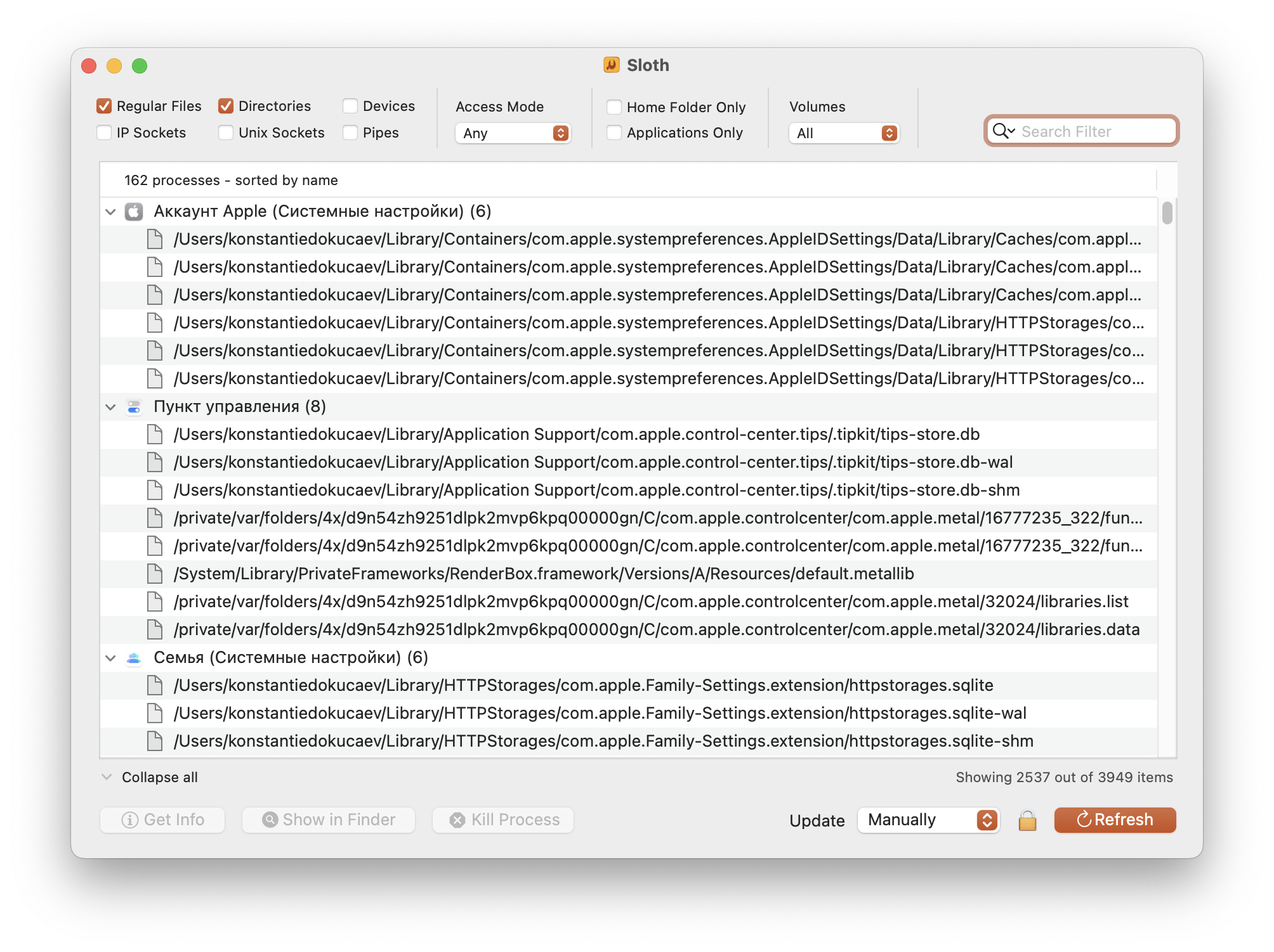 На macOS получить доступ к подобной информации можно с помощью бесплатной утилиты Sloth.