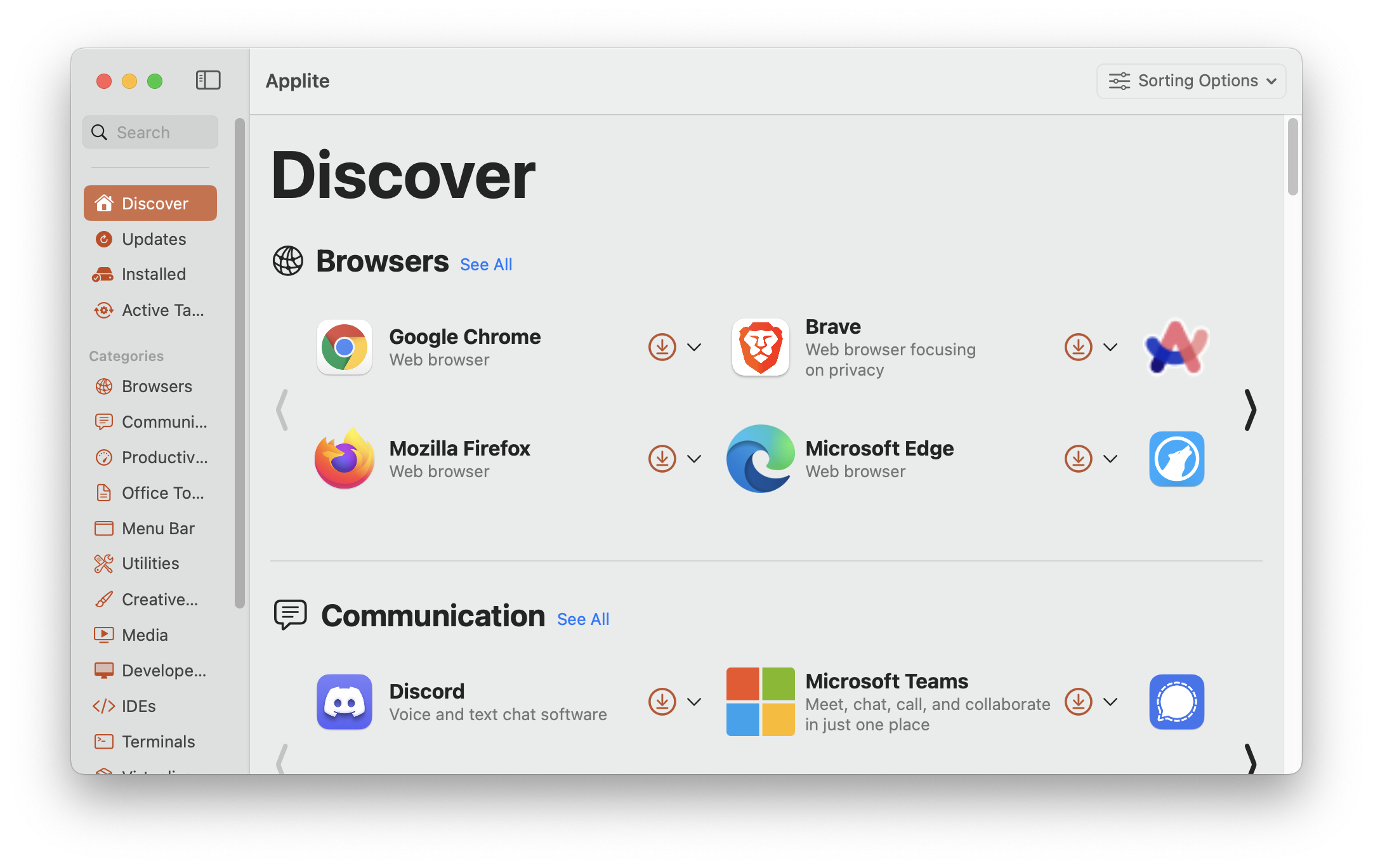 Applite во многом дублирует возможности дефолтного App Store. На левой панели доступен поиск по приложениям, а также разделение на различные категории. Дополнительно вы можете просмотреть приложения, требующие обновления. Также есть сортировка по алфавиту или наиболее скачиваемым.