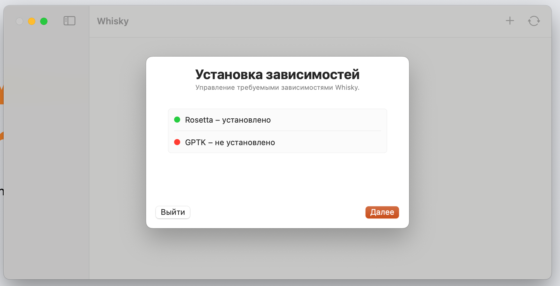 При первом запуске Whisky проверит установку необходимых зависимостей в вашей системе. Переживать ни о чем не стоит. Если чего-то не установлено, то при нажатии на кнопку Далее, все будет установлено автоматически.