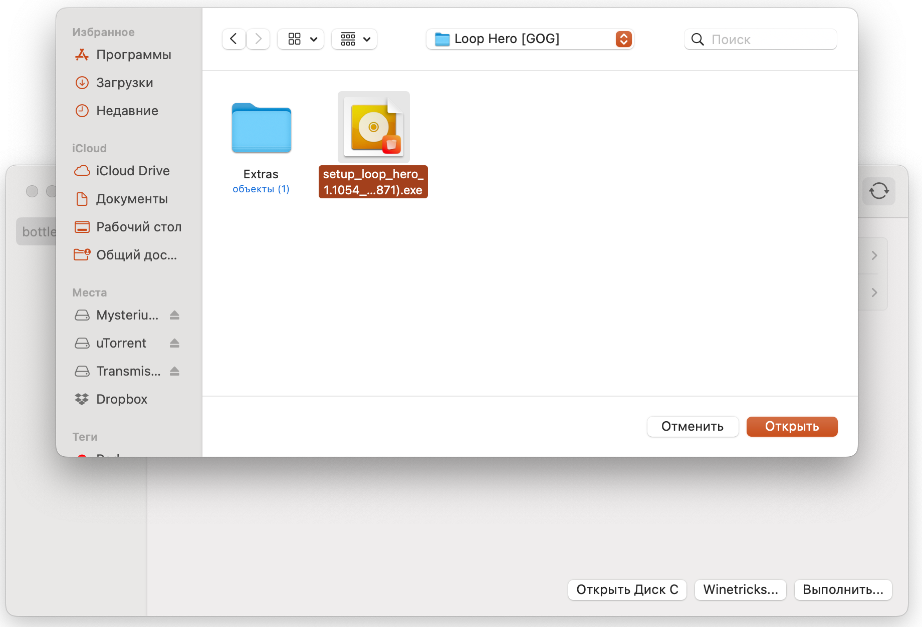 Чтобы запустит игру, приложение, установщик и что угодно другое в главном окне Whisky нужно нажать кнопку Выполнить и выбрать исполняемый файл.