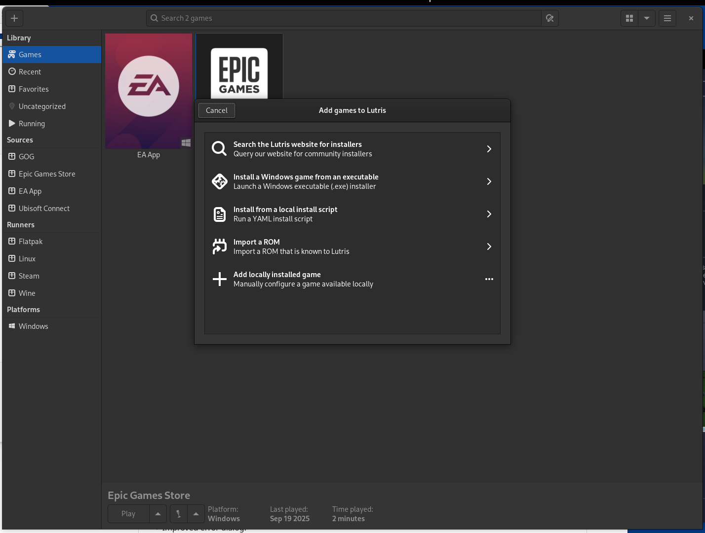 Упростить установку современных или даже ретро игр с самых разных платформ можно с помощью приложения Lutris. По сути это лаунчер игр по типу Steam, который автоматизирует установку всего необходимого софта для запуска игры.