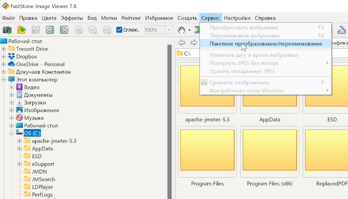 Установите и запустите FastStone Image Viewer. В меню Сервис выберите пункт Пакетное преобразование/переименование.