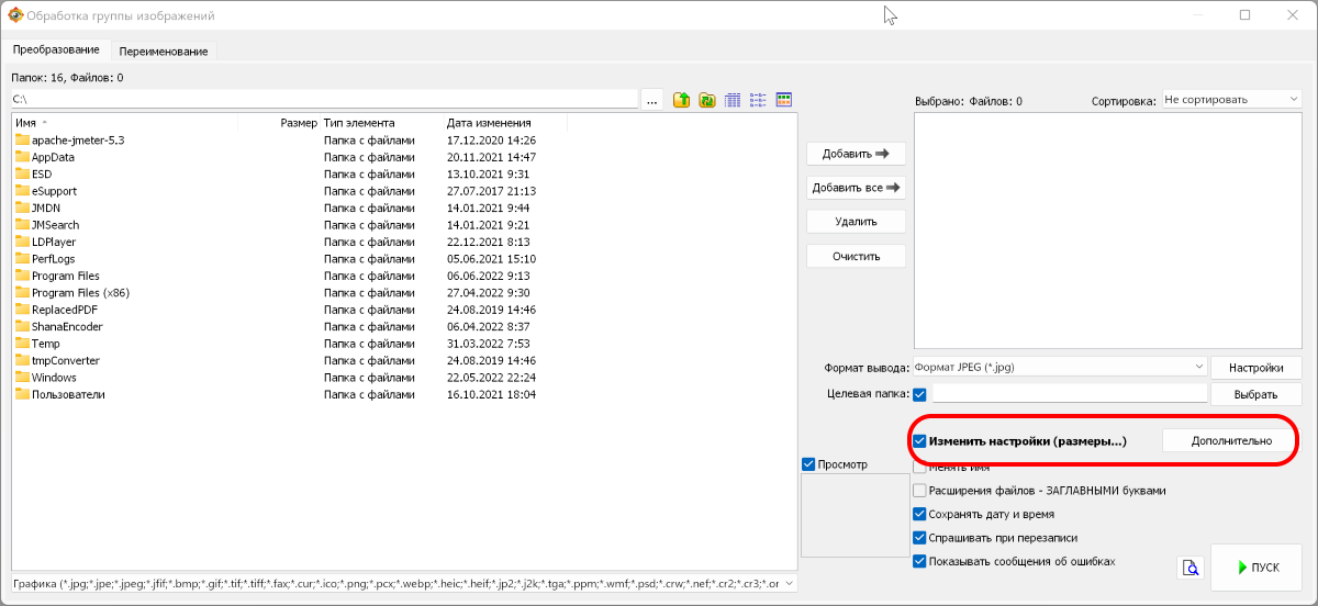 Так вы попадёте в мастер массовой обработки изображений. В нём активируйте чекбокс Изменить настройки (размеры...) и нажмите кнопку Дополнительно.