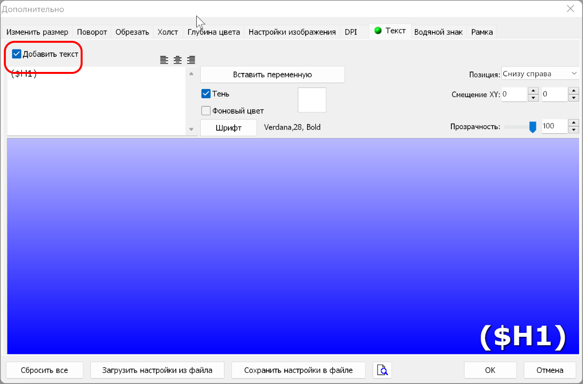 В новом окне есть несколько вкладок, но нам нужна Текст. Перейдите в неё и активируйте чекбокс Добавить текст.