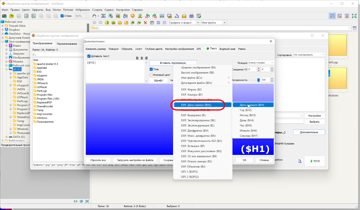 Здесь вы можете отредактировать параметры будущего текста в соответствии с вашими пожеланиями. А вот чтобы добавить информацию из метаданных, нужно нажать кнопку Вставить переменную, выбрать пункт EXIF: Дата съёмки и выбрать нужный формат даты.