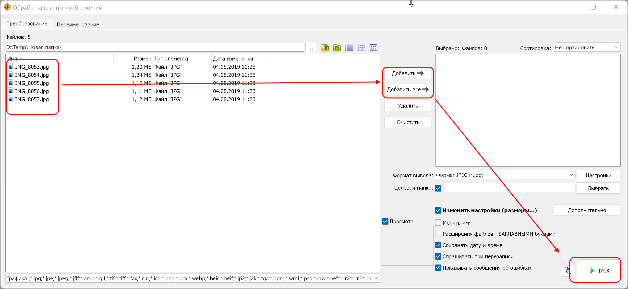 После добавления текста нажмите OK и вернитесь в окно обработки изображений. В нём выберите нужные файлы, добавьте их в обработку и нажмите кнопку Пуск.