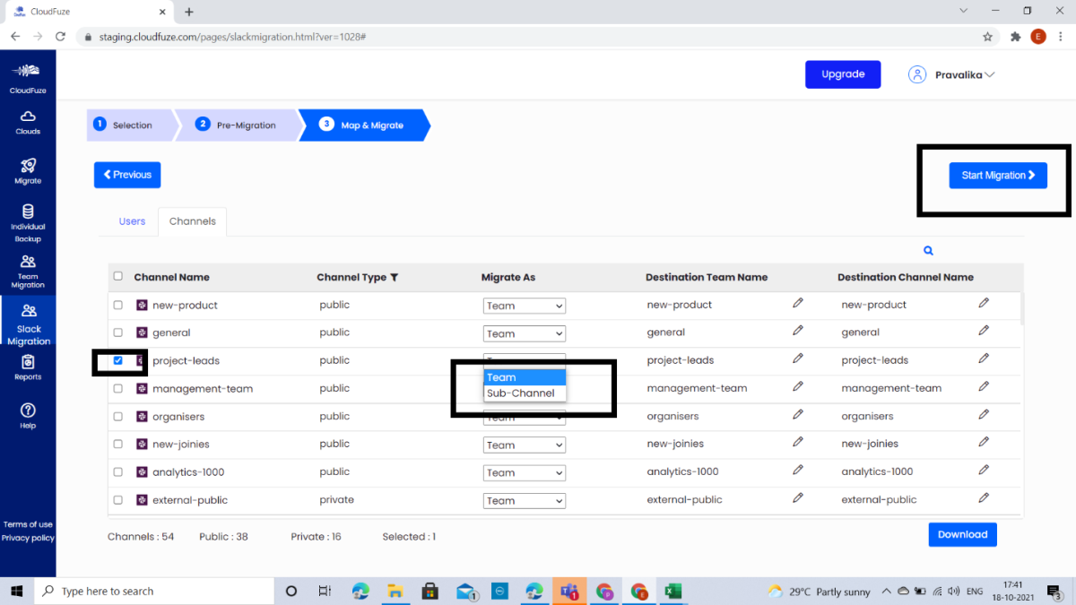 Шаг 5. Перейдите на вкладку Channels и выберите каналы для миграции. При нажатии на Migrate As можно выбрать тип миграции (обычный чат или суб-чат). Также можно переименовать канал нажатием на Destination Channel Name.