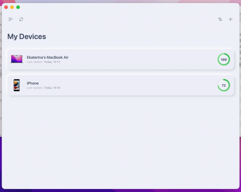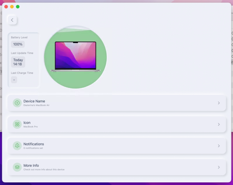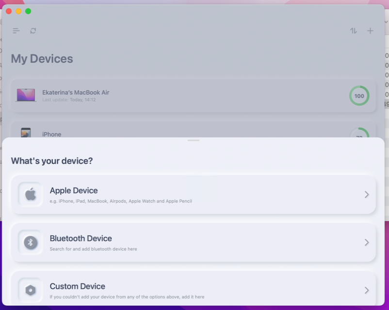 Если установить приложение на iPhone или MacBook, то сразу после его запуска вы будете видеть уровень заряда всех устройств.