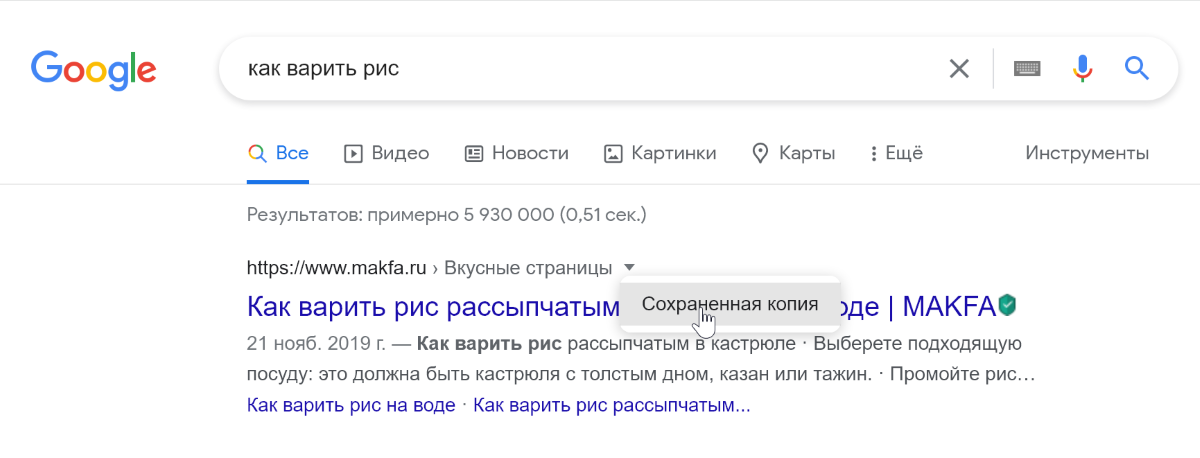 Я покажу на примере Google, но подобная фишка есть и у других популярных поисковиков. Для этого рядом с результатами поиска нажмите на стрелочку и выберите пункт Сохранённая копия.