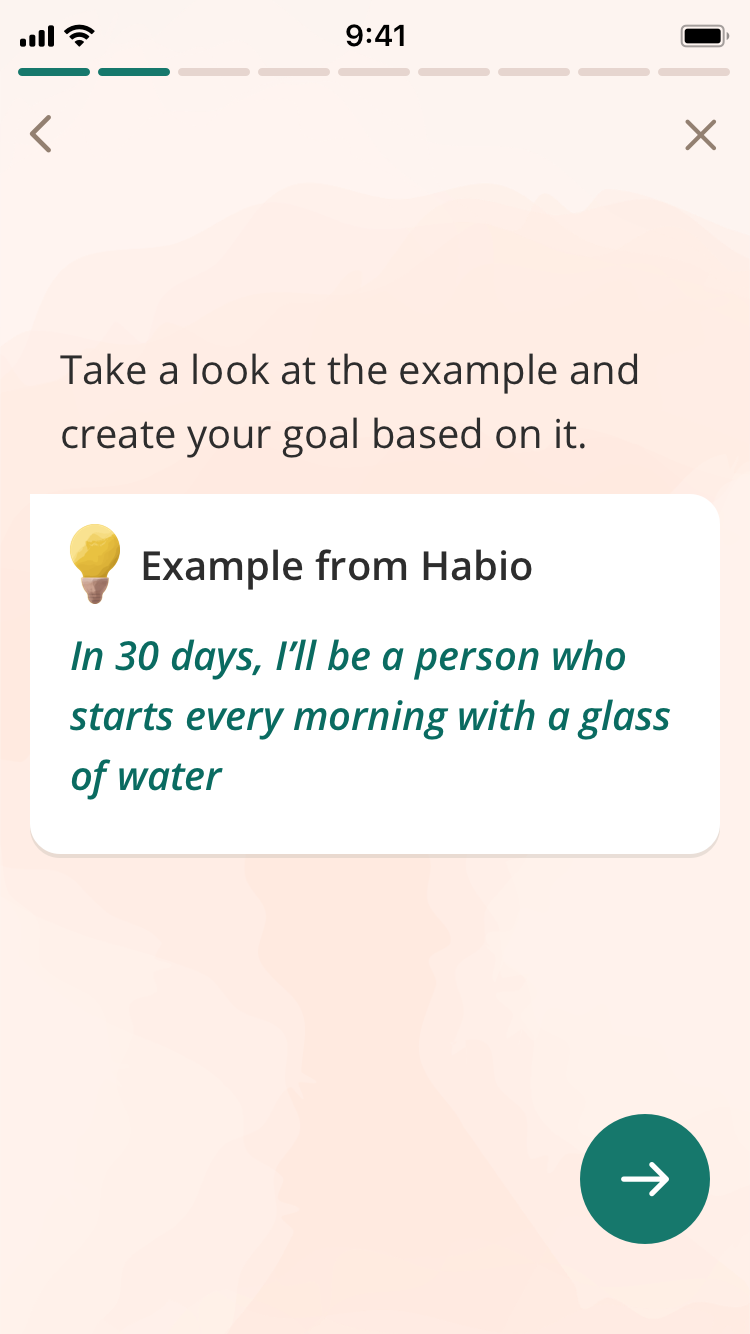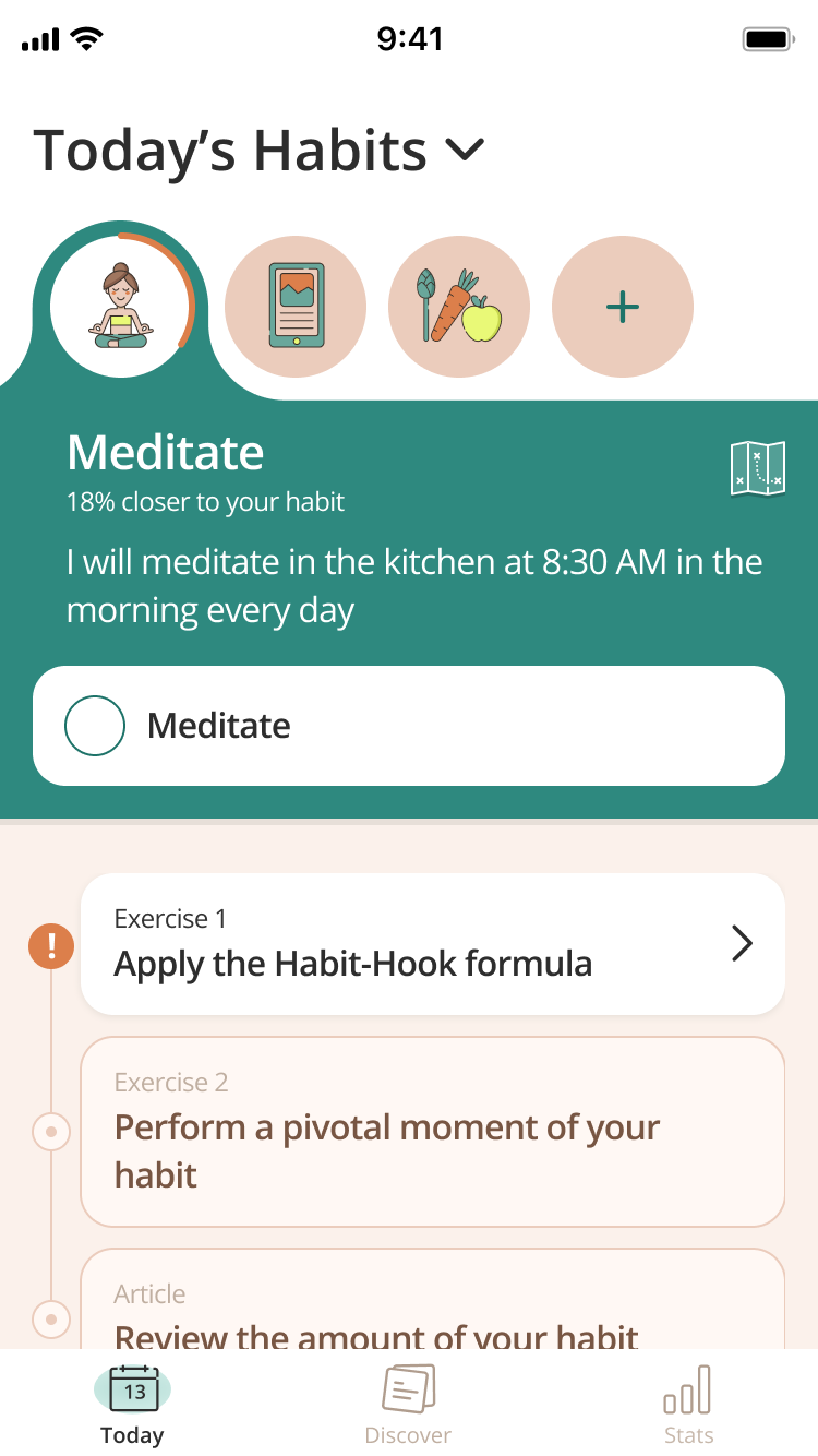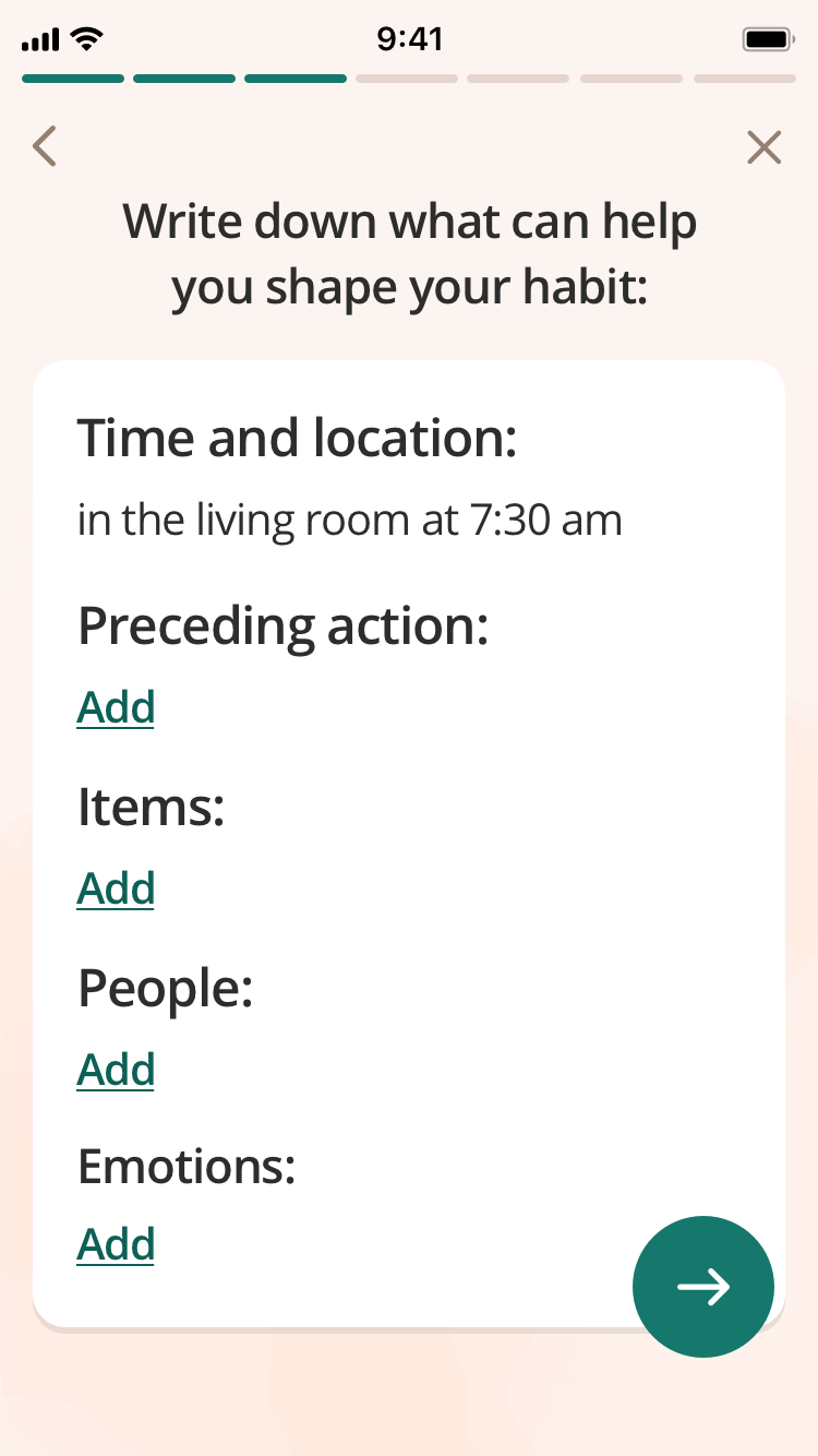 Создание привычки — пошаговое: так, приложение последовательно помогает пользователю правильно настроить себя на выполнение привычки. Предлагает выбрать точное время, создать подходящую атмосферу. Например, пить воду из самого красивого стакана, делать йогу на красивом коврике с зажженной свечой или благовониями. Так мозгу будет легче настроиться на регулярное выполнение привычки и поддерживать мотивацию.