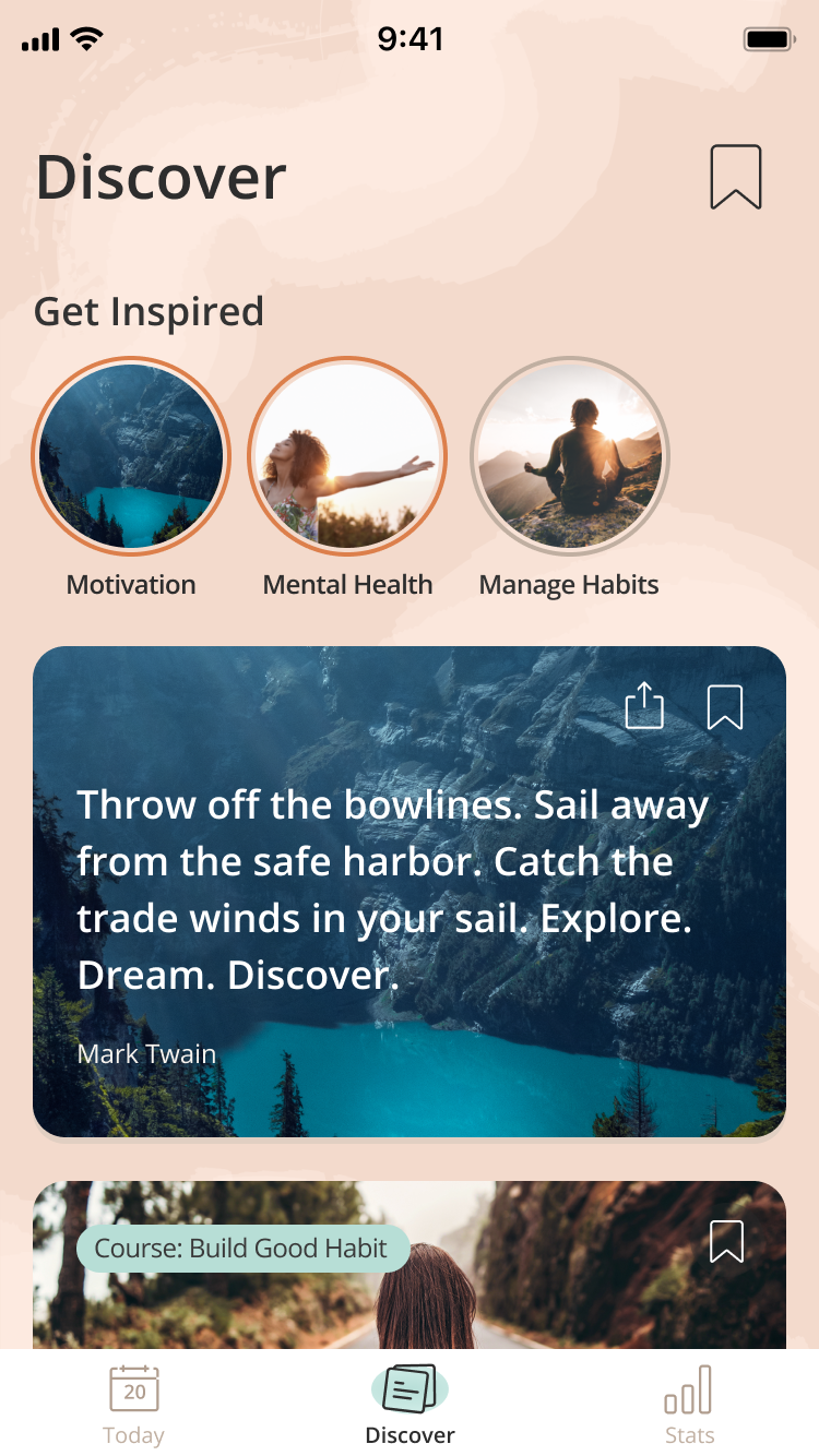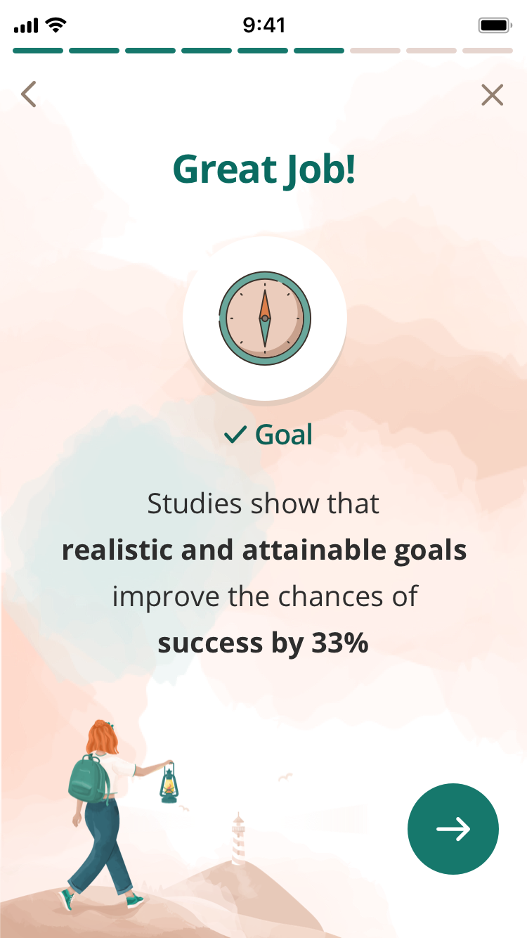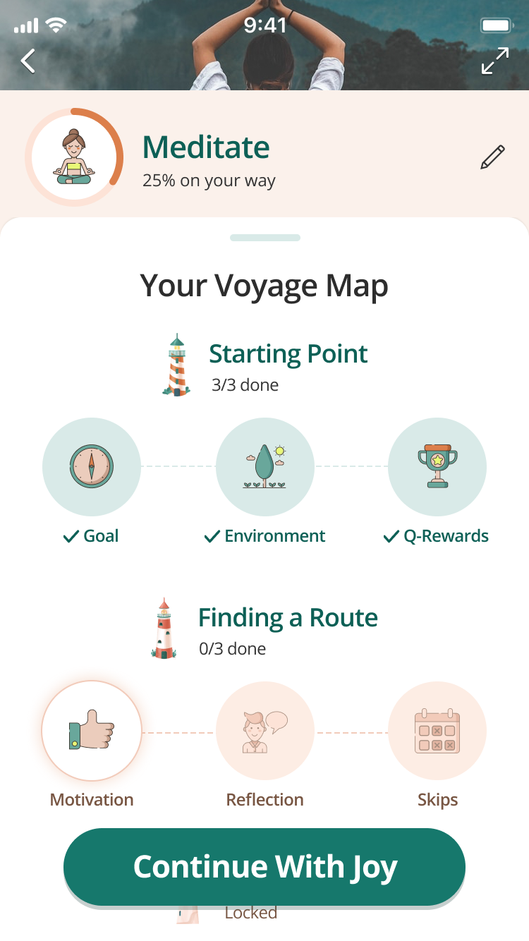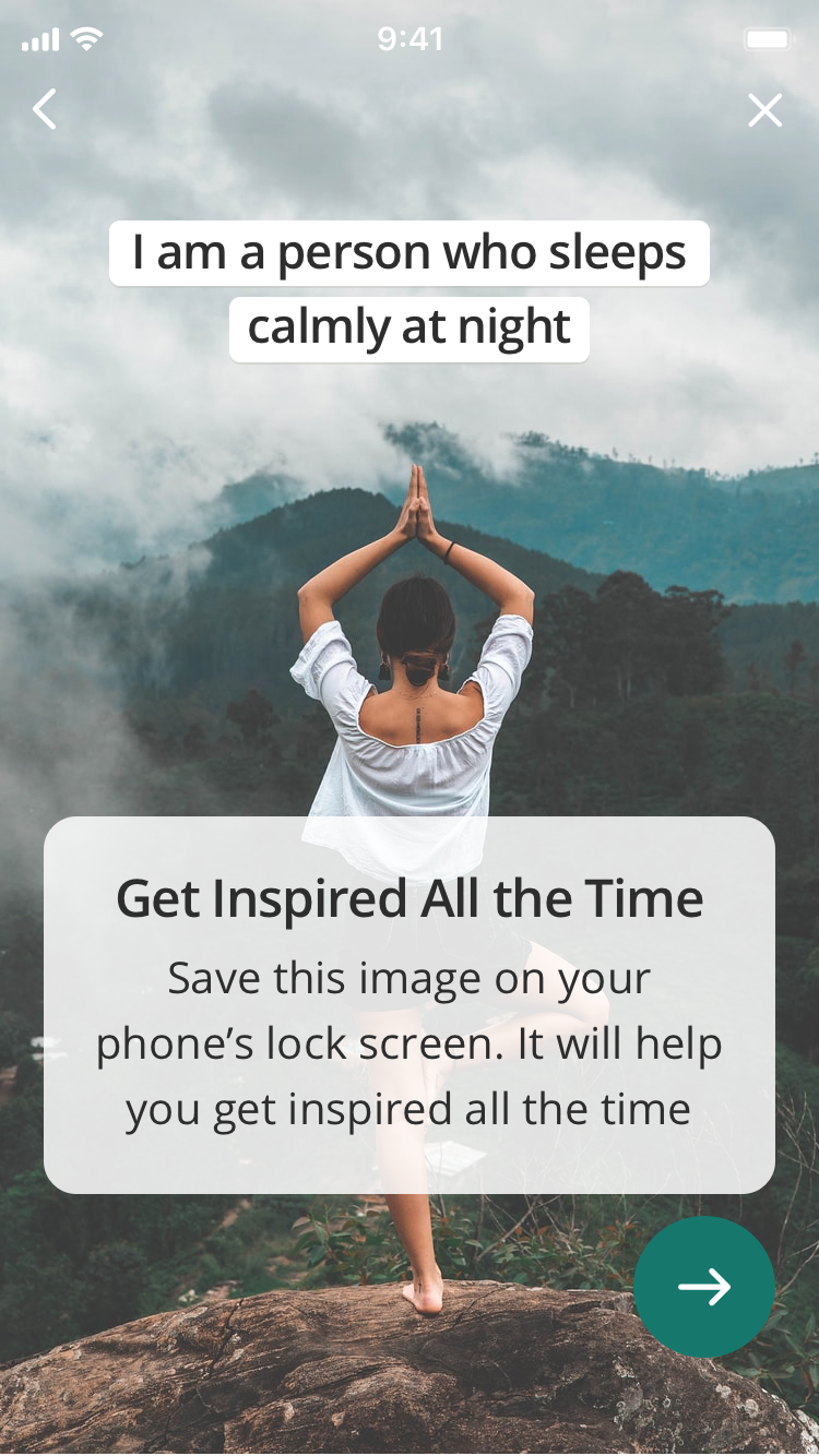 Создание привычки — пошаговое: так, приложение последовательно помогает пользователю правильно настроить себя на выполнение привычки. Предлагает выбрать точное время, создать подходящую атмосферу. Например, пить воду из самого красивого стакана, делать йогу на красивом коврике с зажженной свечой или благовониями. Так мозгу будет легче настроиться на регулярное выполнение привычки и поддерживать мотивацию.