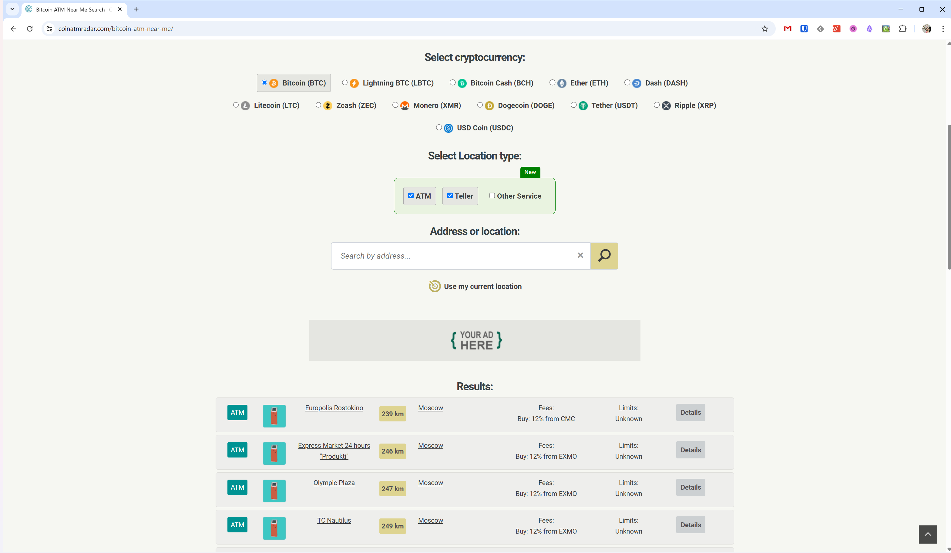 Результаты поиска можно отфильтровать по типу принимаемой криптовалюты. Поддерживается не только BTC, но и LBTC, ETH, DASH и многие другие.
