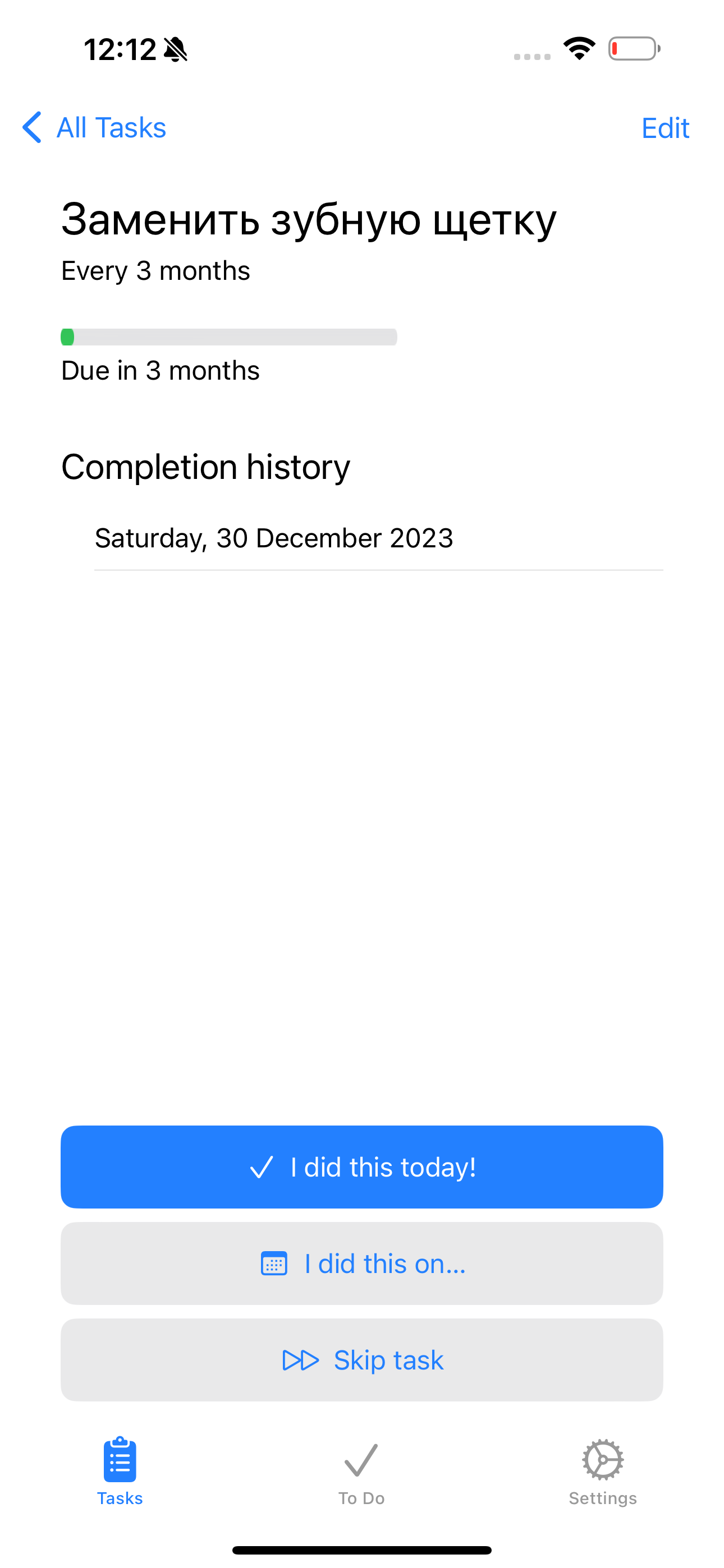 После чего задача отобразится в общем списке с отсчётом до даты её выполнения. Вы можете всегда перейти в задачу и посмотреть историю выполнения, а также выполнить или скипнуть её.