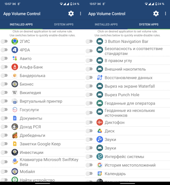 Сделать это очень просто. В App Volume Control все приложения смартфона разделены на установленные и системные. Выберите нужное приложение, и просто переключите тумблер для него.