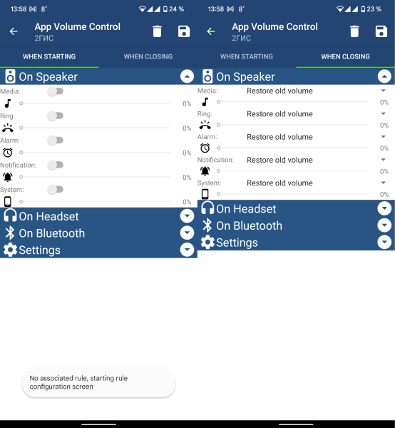 После настройки правила его нужно просто сохранить. Теперь при запуске приложения, подходящего под правило, все уровни громкости будут выставлены согласно вашим настройкам.