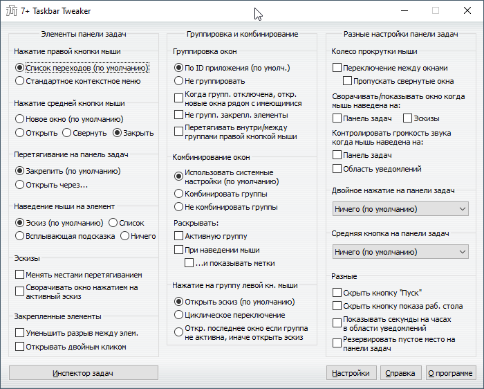 Всего приложение управляет тремя типами параметров панели задач: элементы, группировка и комбинирование, прочие параметры.