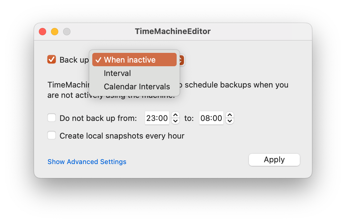 Есть три варианта запуска: при неактивности пользователя, в определённые промежутки времени или настроить сразу несколько интервалов. Во всех случаях вы можете задать часы для работы Time Machine и активировать ежечасный бекап.