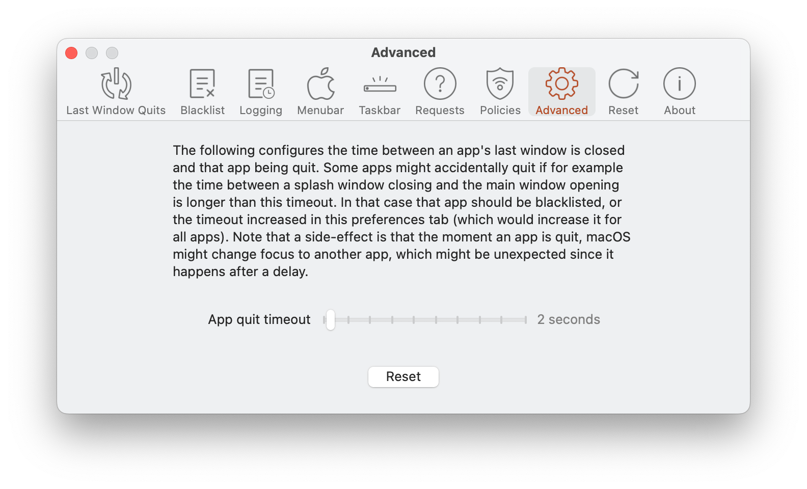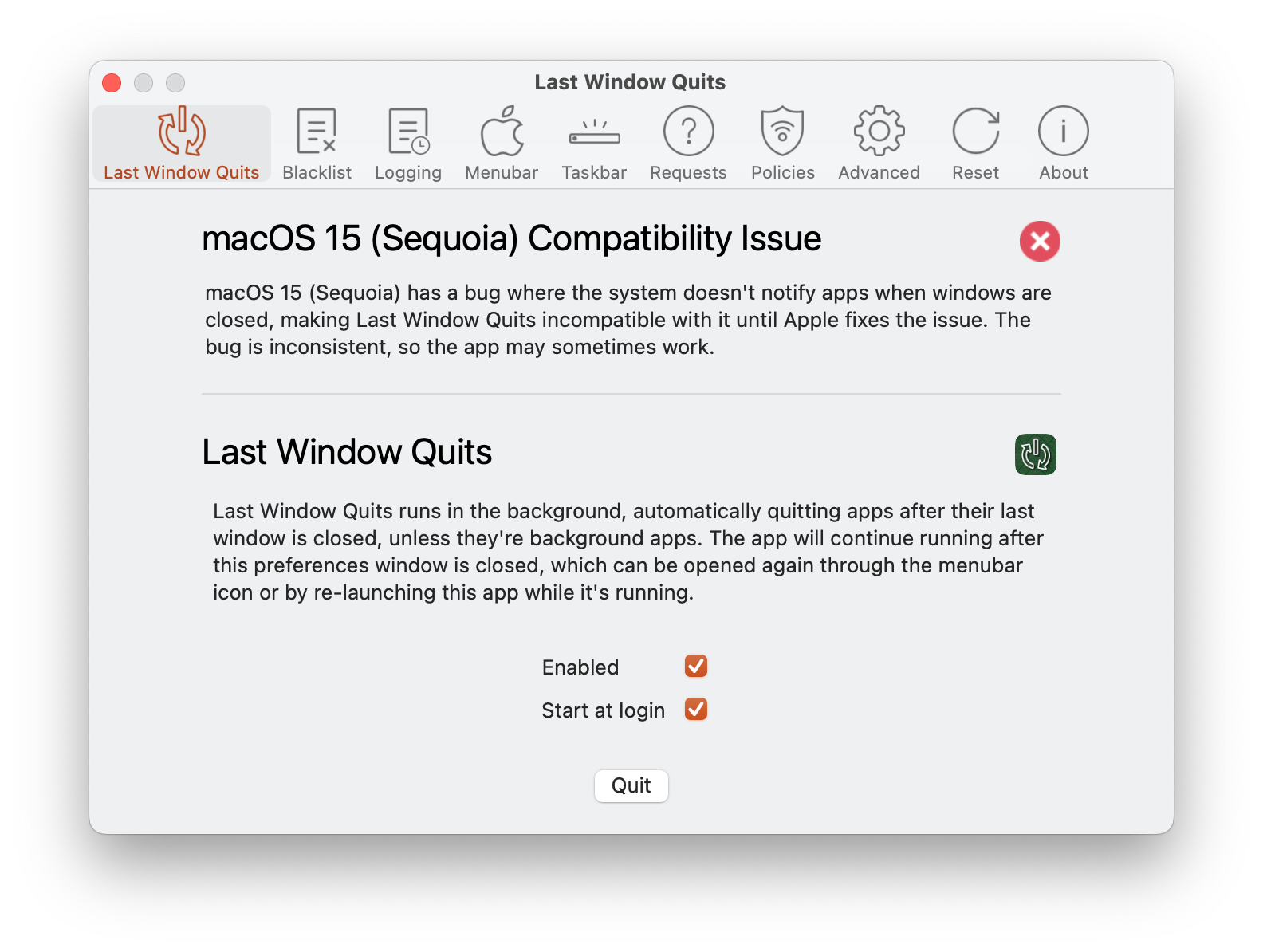 Как вы можете увидеть на скриншотах выше, параметров у утилиты не так уж и много. В разделе Last Window Quits можно задать параметры автозапуска и временно выключить приложение.