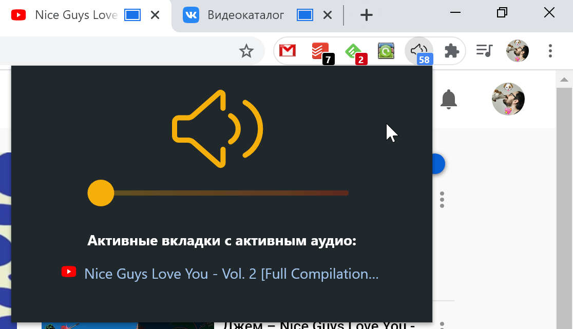 Если у вас открыта вкладка, на которой воспроизводится звук, при запуске расширения вы сможете отрегулировать уровень громкости для неё.