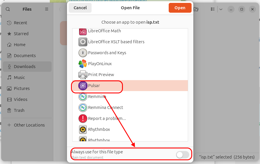 Теперь вам нужно выбрать приложение по умолчанию для открытия таких файлов. Благодаря нашим предыдущим действиям среди доступных для выбора есть Pulsar.