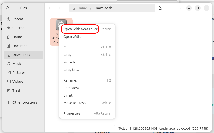 Теперь на скачанном файле AppImage нажмите правой кнопкой и в контекстном меню выберите пункт Open With Gear Lever.