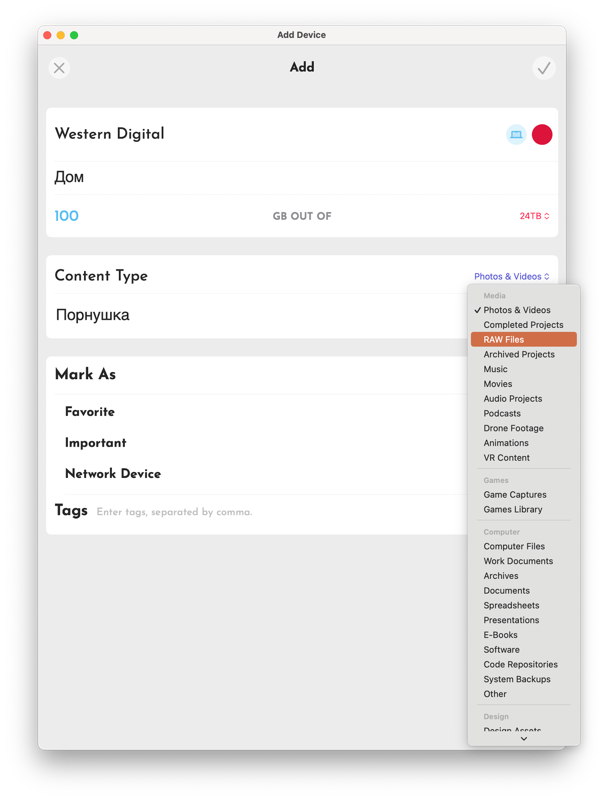 Ниже можно выбрать тип контента на диске и добавить его описание. Ещё можно выбрать тип носителя (избранное, важное сетевое устройство) и добавить теги.