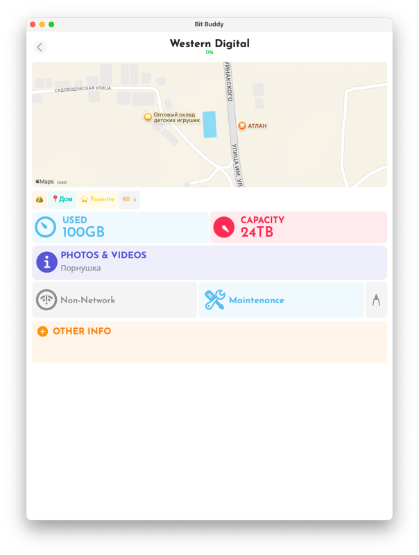 Для этого при первом запуске Bit Buddy в него нужно добавить внешний накопитель. Вы можете указать его название, выбрать цвет и иконку. Дополнительно добавляется местоположение, доступный и текущий объём.