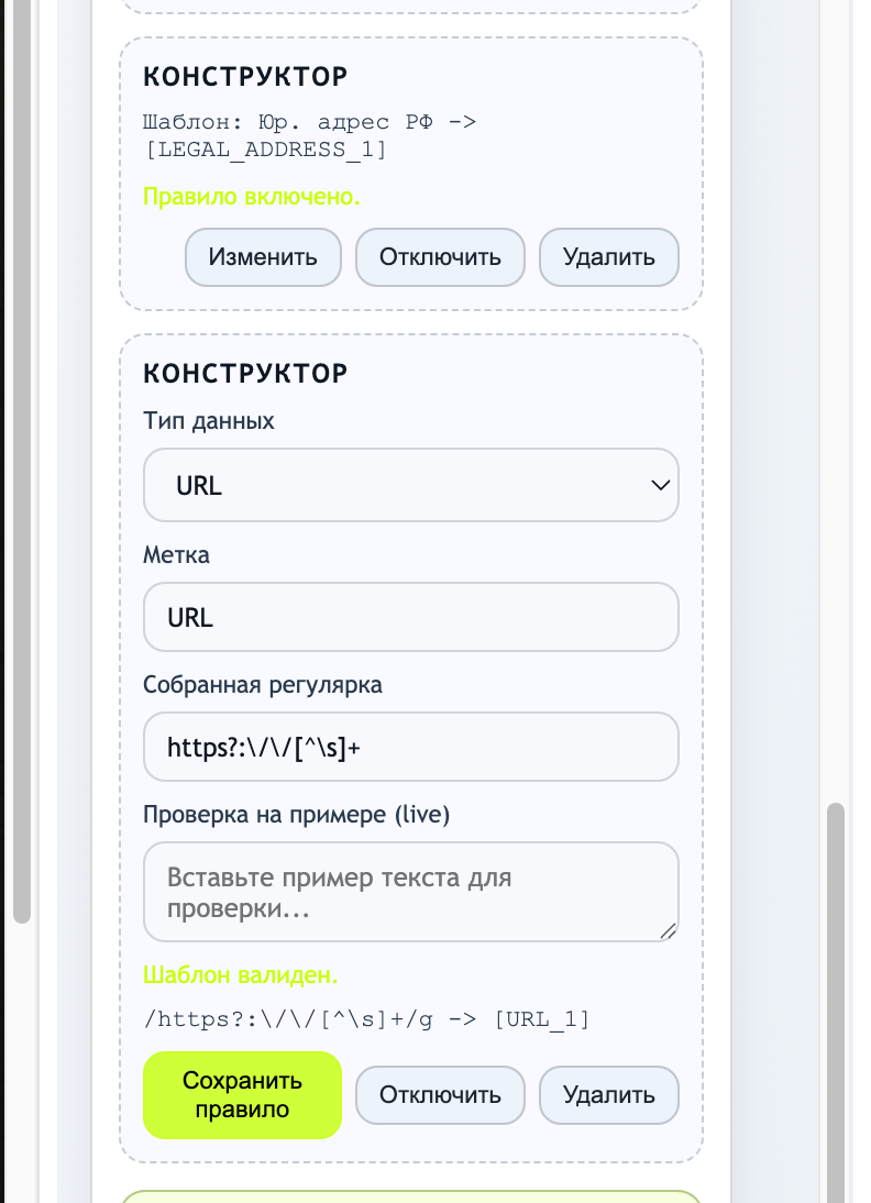 Для этого нужно выбрать тип данных и задать маску, по которой расширение будет определять, какой текст нужно затереть. Здесь же можно проверить качество работы нового правила без реального общения с нейросетью.