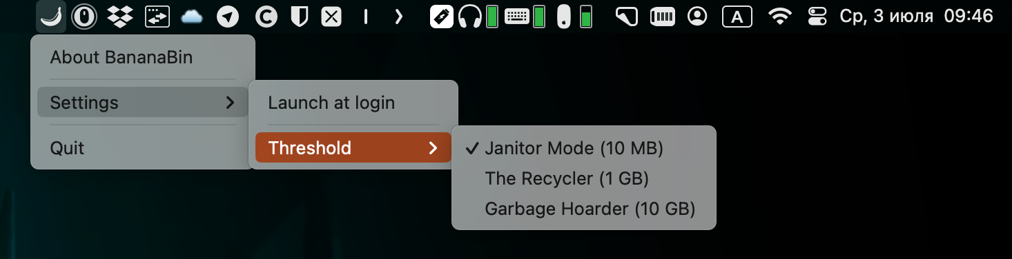 Если вы тоже любите пустую корзину, но хотите очищать её только при заполнении до определённого объёма, то вам может зайти приложение BananaBin.
