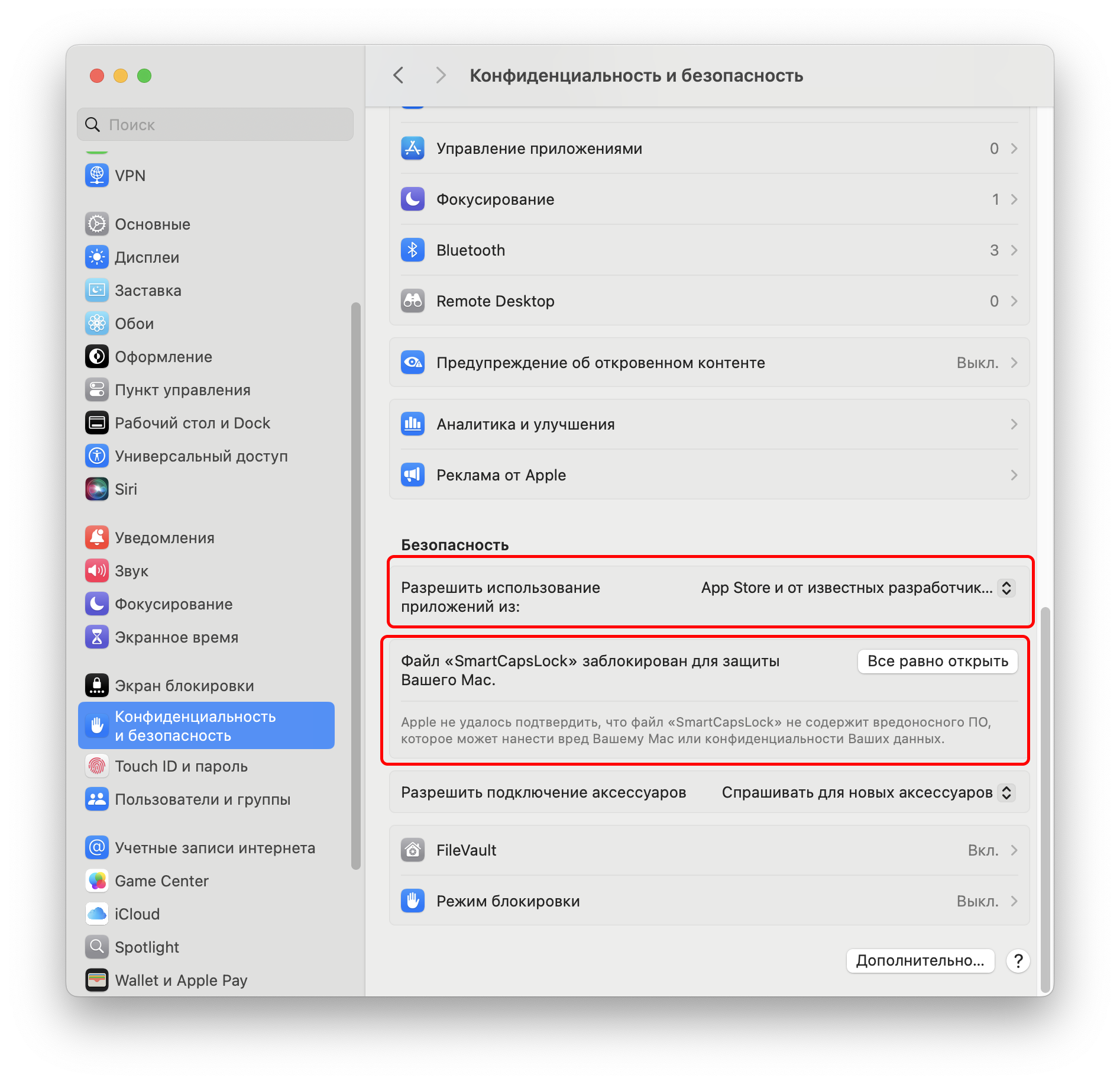 Теперь, чтобы запускать подобные приложения, вам нужно перейти в Системные настройки, а затем в Конфиденциальность и безопасность.