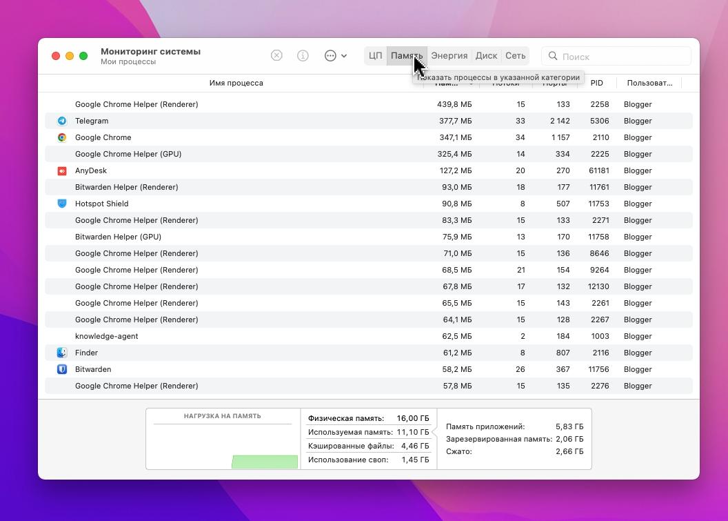 В открывшемся окне перейдите на вкладку Память. Теперь все процессы отсортированы — от самого прожорливого до самого менее затратного для ресурсов Mac.
