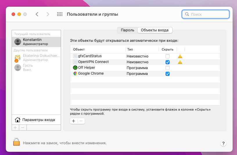 Для этого откройте Системные настройки > Пользователи и группы. Выберите свой основной аккаунт и перейдите на вкладку Объекты входа.
