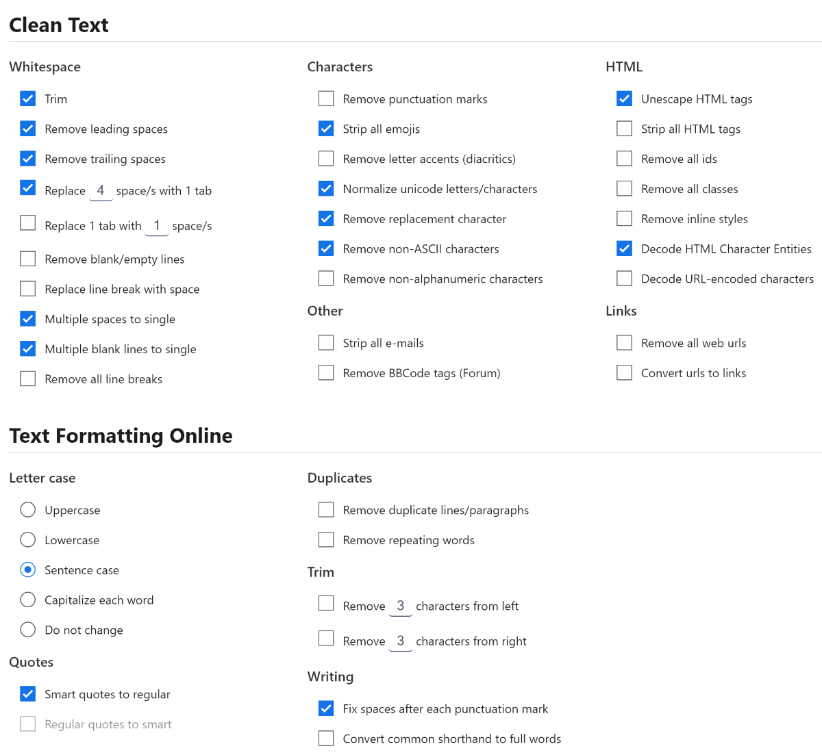 Для очистки доступна пара десятков инструментов, которые можно применять одновременно, а некоторые даже немного настроить. Все они разделены на две основные категории: очистка текста и форматирование.