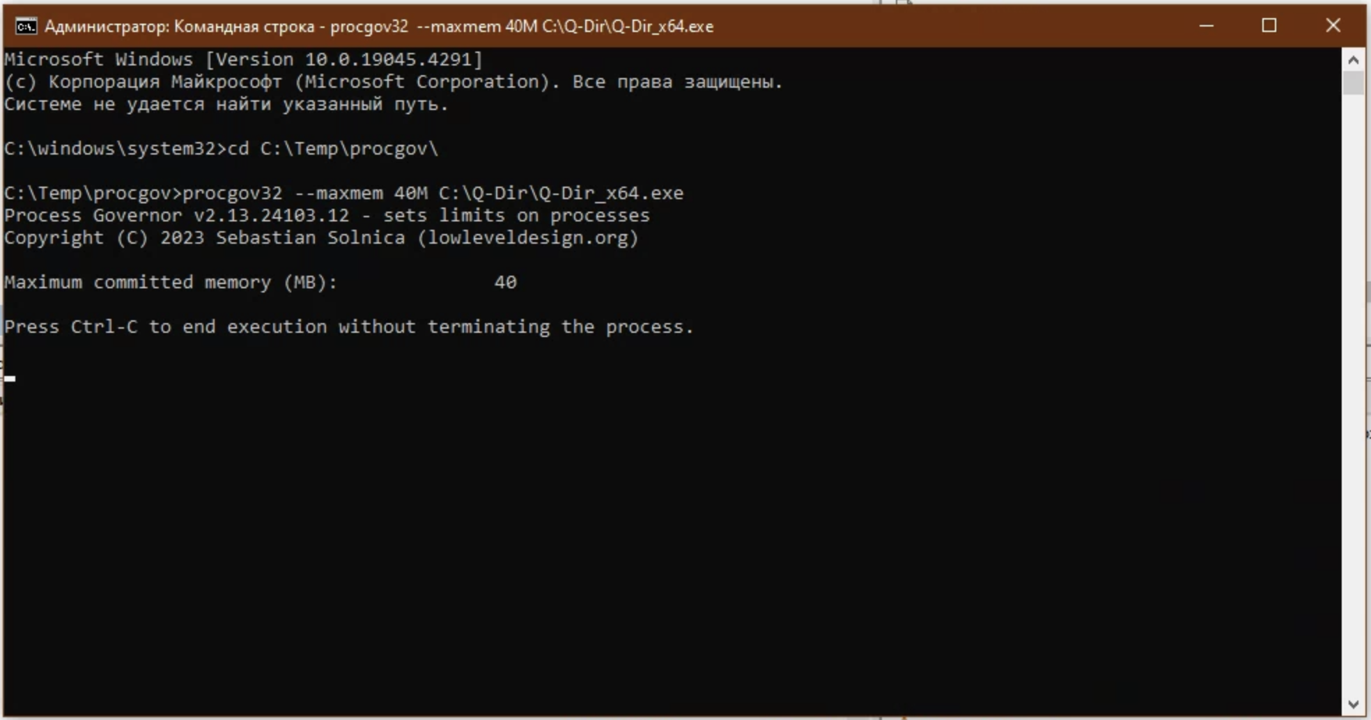 procgov32 --maxmem 40M c:\temp\test.exe - Действие: Запускает новый процесс test.exe с ограничением памяти до 40 мегабайт.