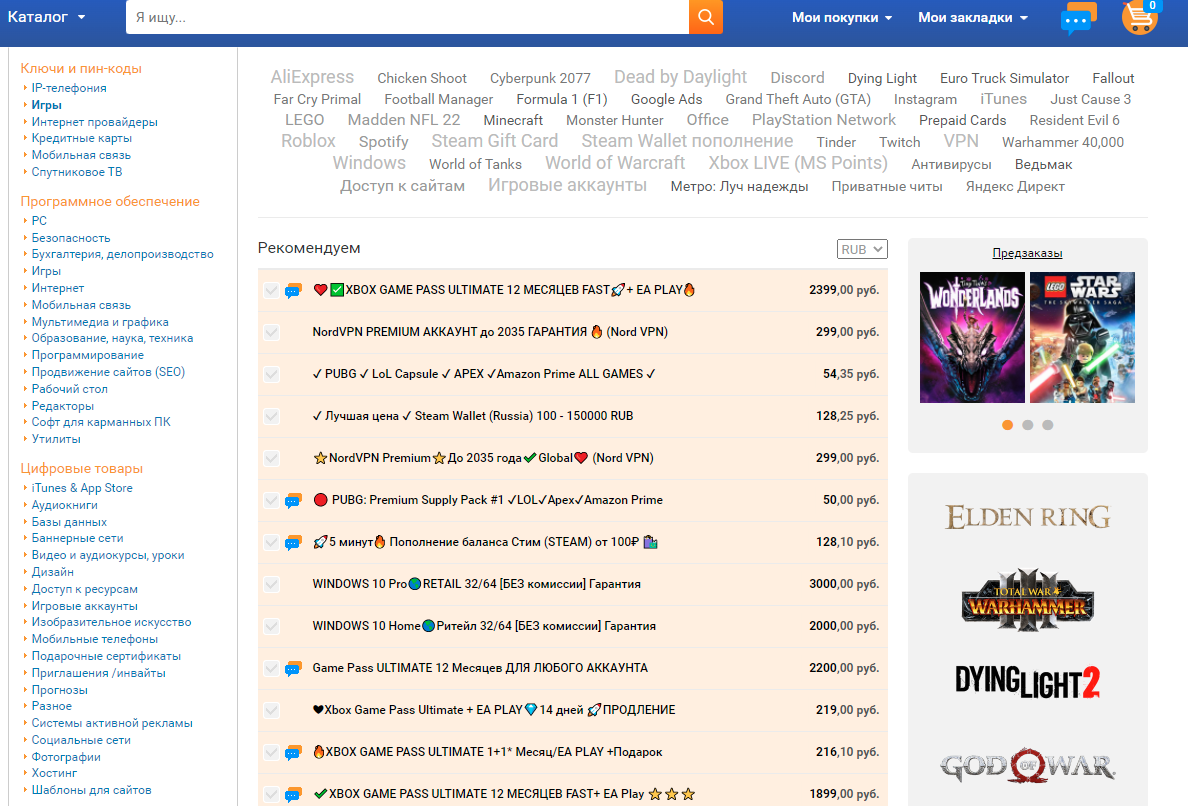 Здесь можно купить ключи к играм, ваучеры PSN, Apple Music, Spotify, аудиокниги, игры, аккаунты на различных ресурсах и многое-многое другое. И в этот момент я хочу ещё раз подчеркнуть сомнительность происхождения любого товара на сайте.