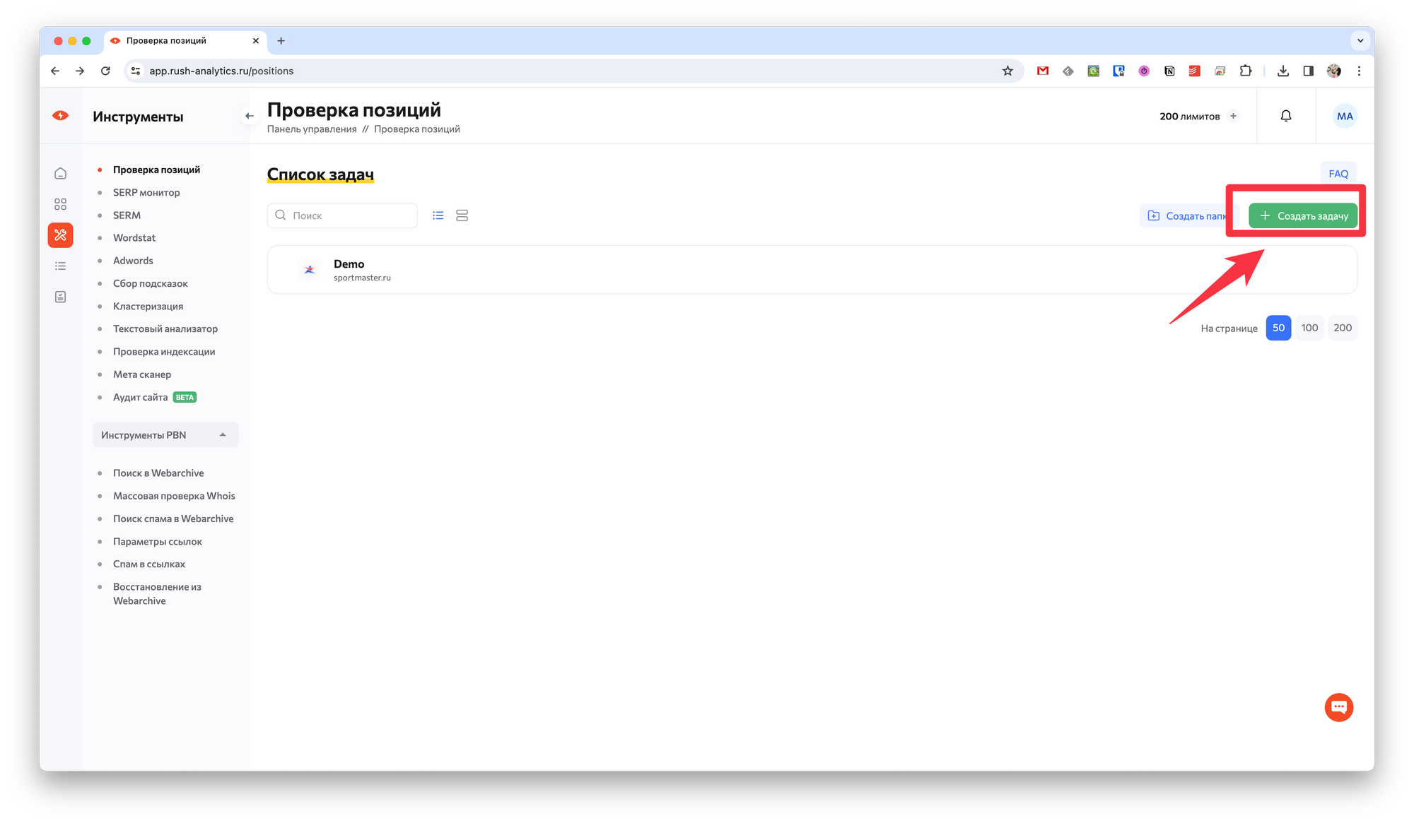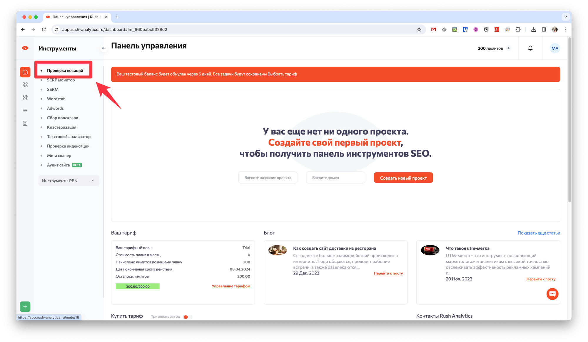 Для этого достаточно авторизоваться в сервисе и в левой панели в разделе Инструменты выбрать пункт Проверка позиций.