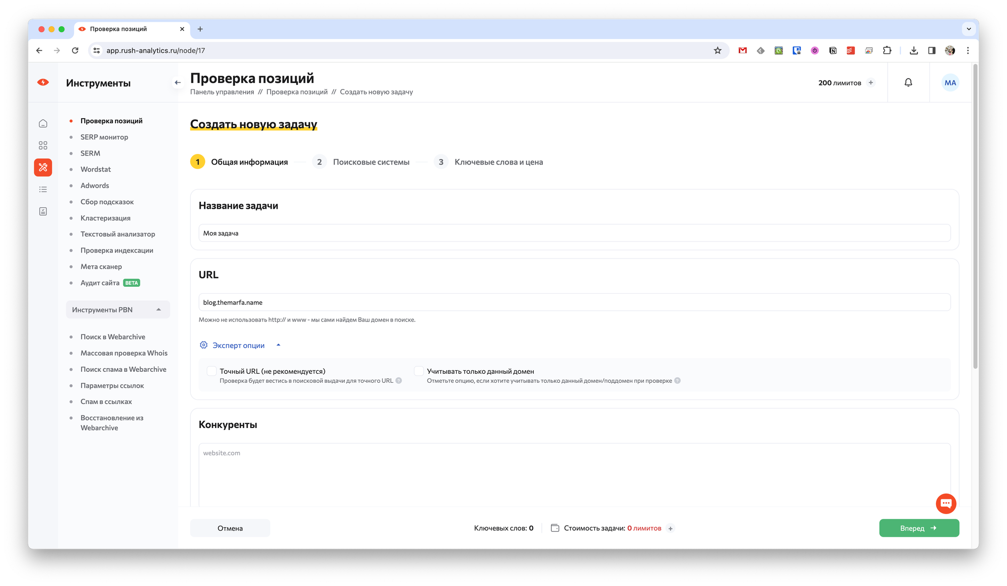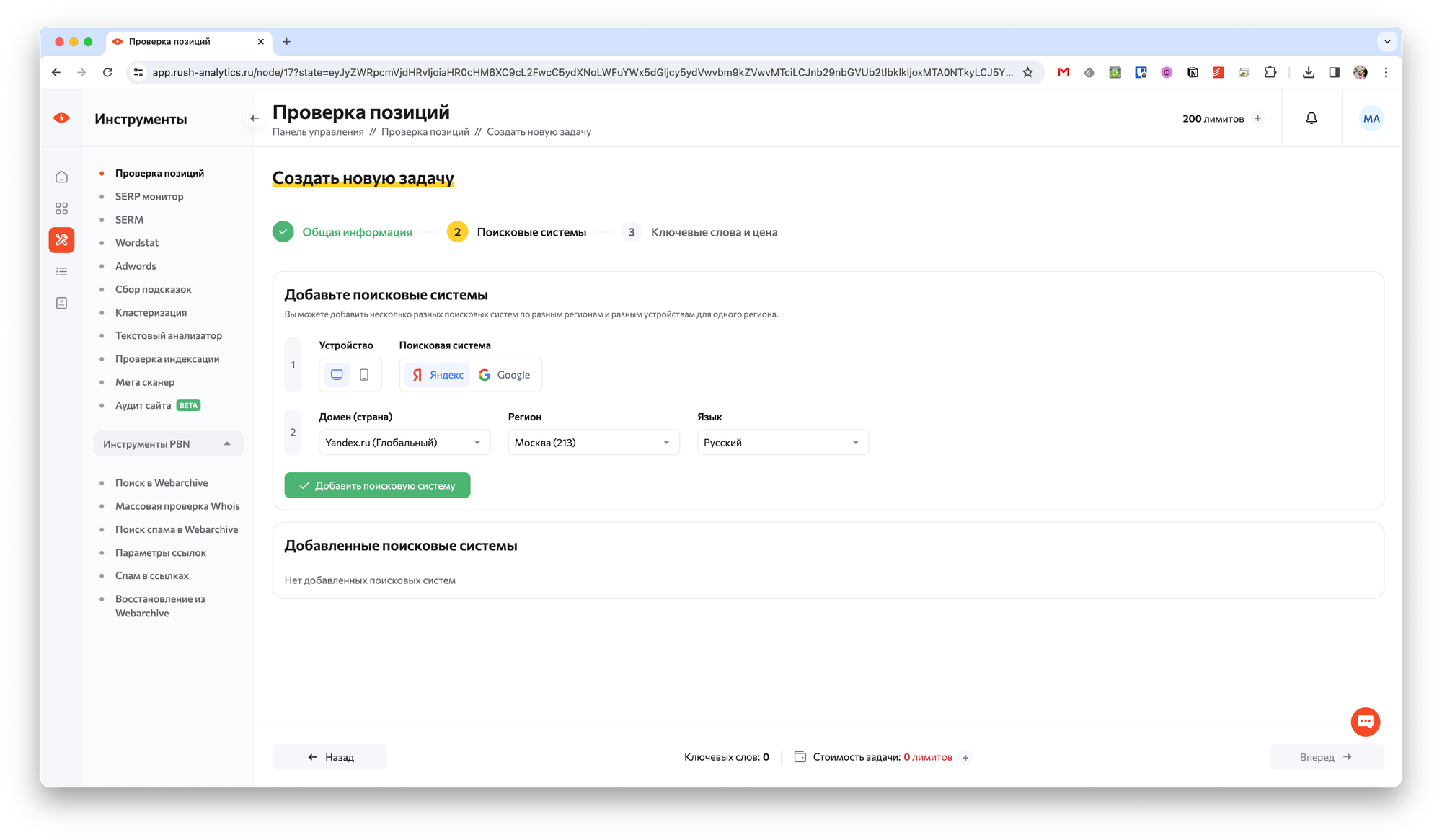 После чего остаётся нажать кнопку Вперёд, а затем настроить дополнительные параметры задачи. Например, можно указать устройство (ПК или мобильный), выбрать поисковую систему и её регион.