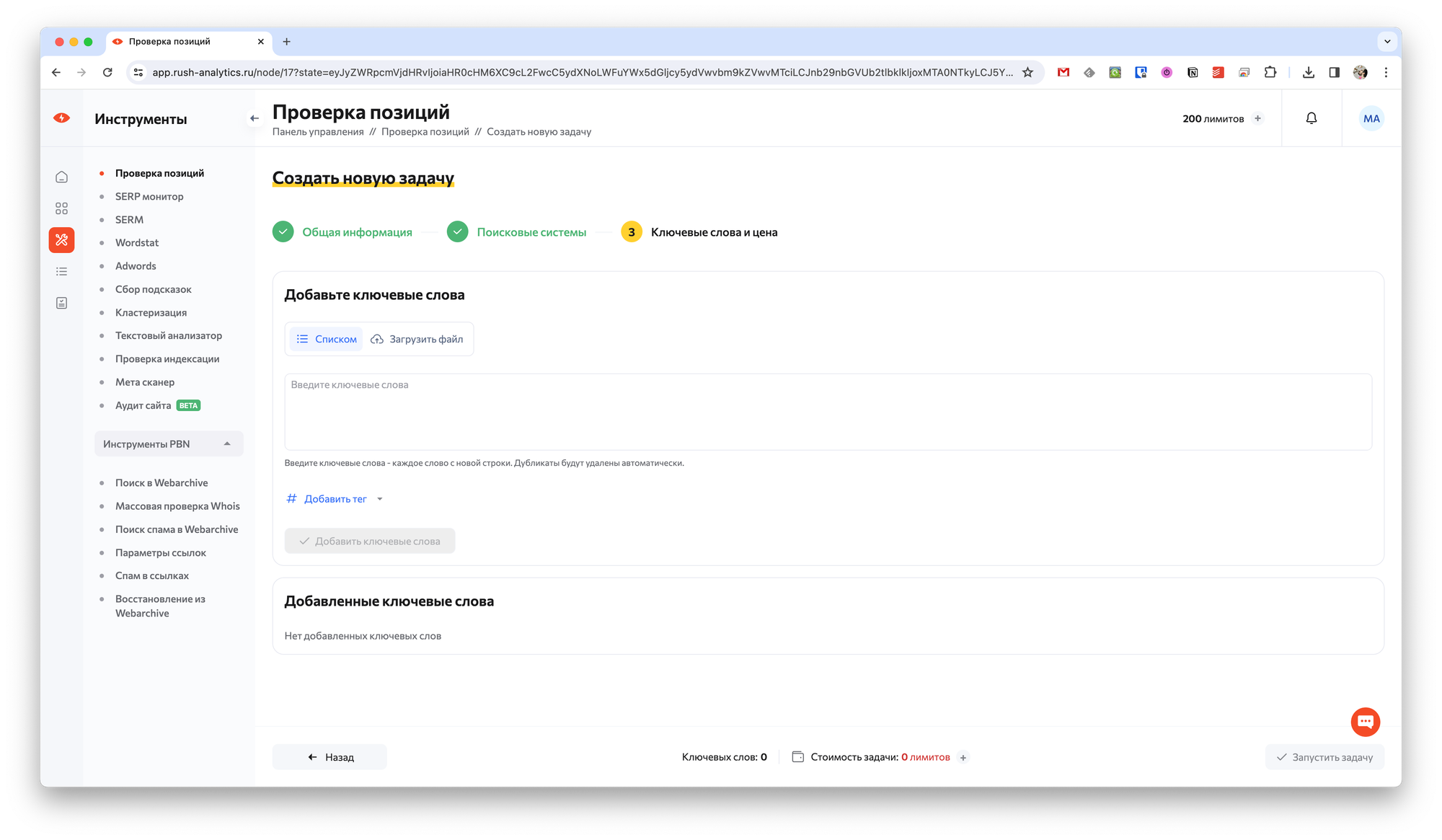 На последнем шаге нужно указать интересующие вас ключевые слова, по которым требуется отслеживание позиций. Слова можно указать вручную или загрузить из файла. Дополнительно можно добавить теги и целевой URL.