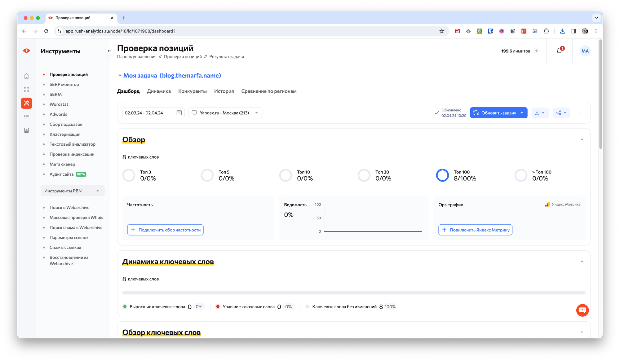 На вкладке Динамика можно увидеть изменение позиций по ключевым словам в течение выбранного периода времени.