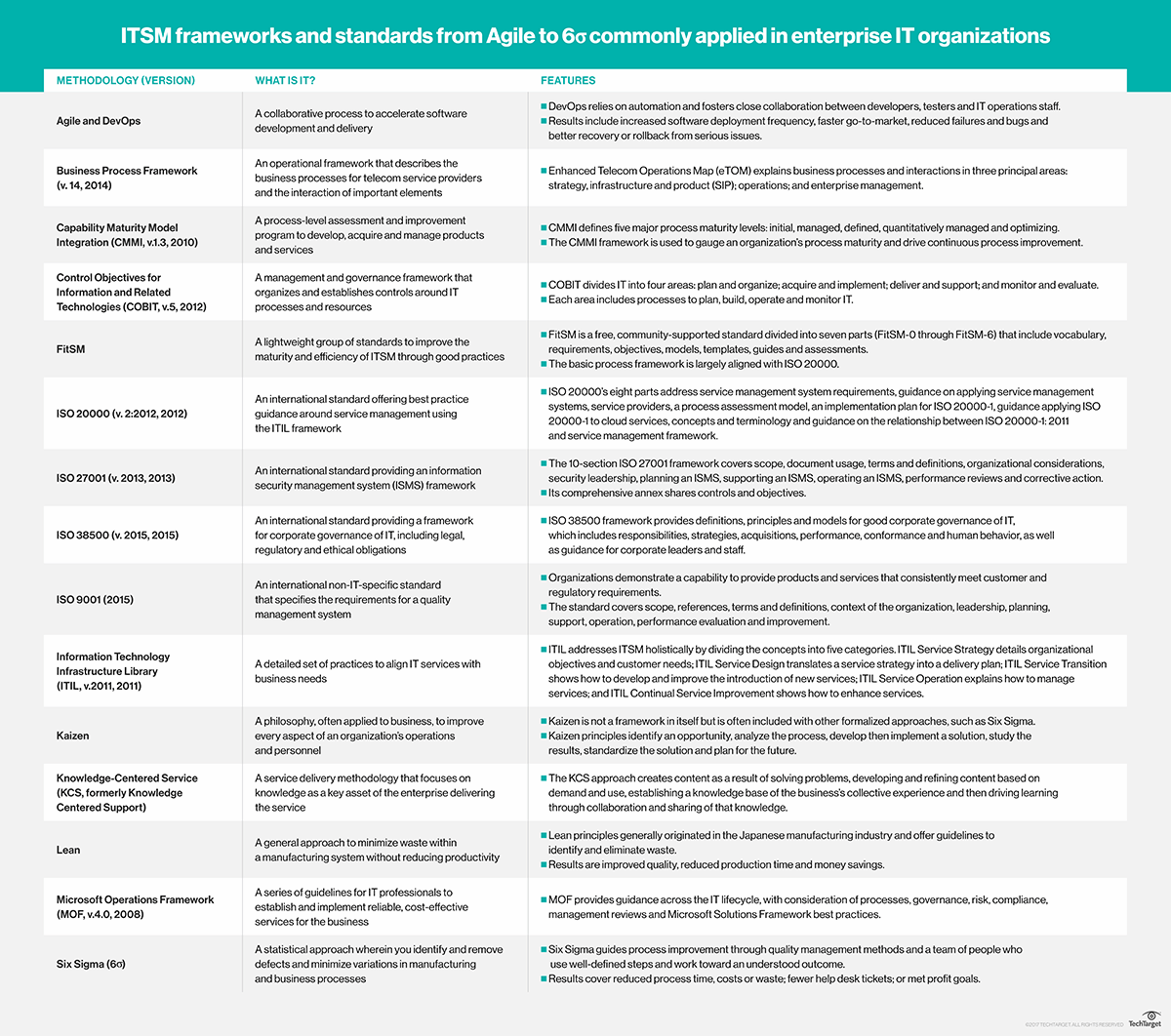 ISO 20000.Организацией под названием ISO создаются разные глобальные стандарты, такие как ISO 20000, в котором описаны требования к системе ITSM. Хотя стандарт был разработан Британским институтом стандартов с целью отражения лучших практик, описанных в рамках ITIL, он поддерживает и другие системы, такие как MOF.