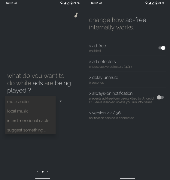 При первом запуске Ad-Free запросить необходимые для работы разрешения, а затем вы сможете выбрать что же делать с рекламой в Spotify: выключить звук или включить локальный файл. При желании в настройках можно поменять фильтры детектора рекламы или выставить задержку до отключения звука.