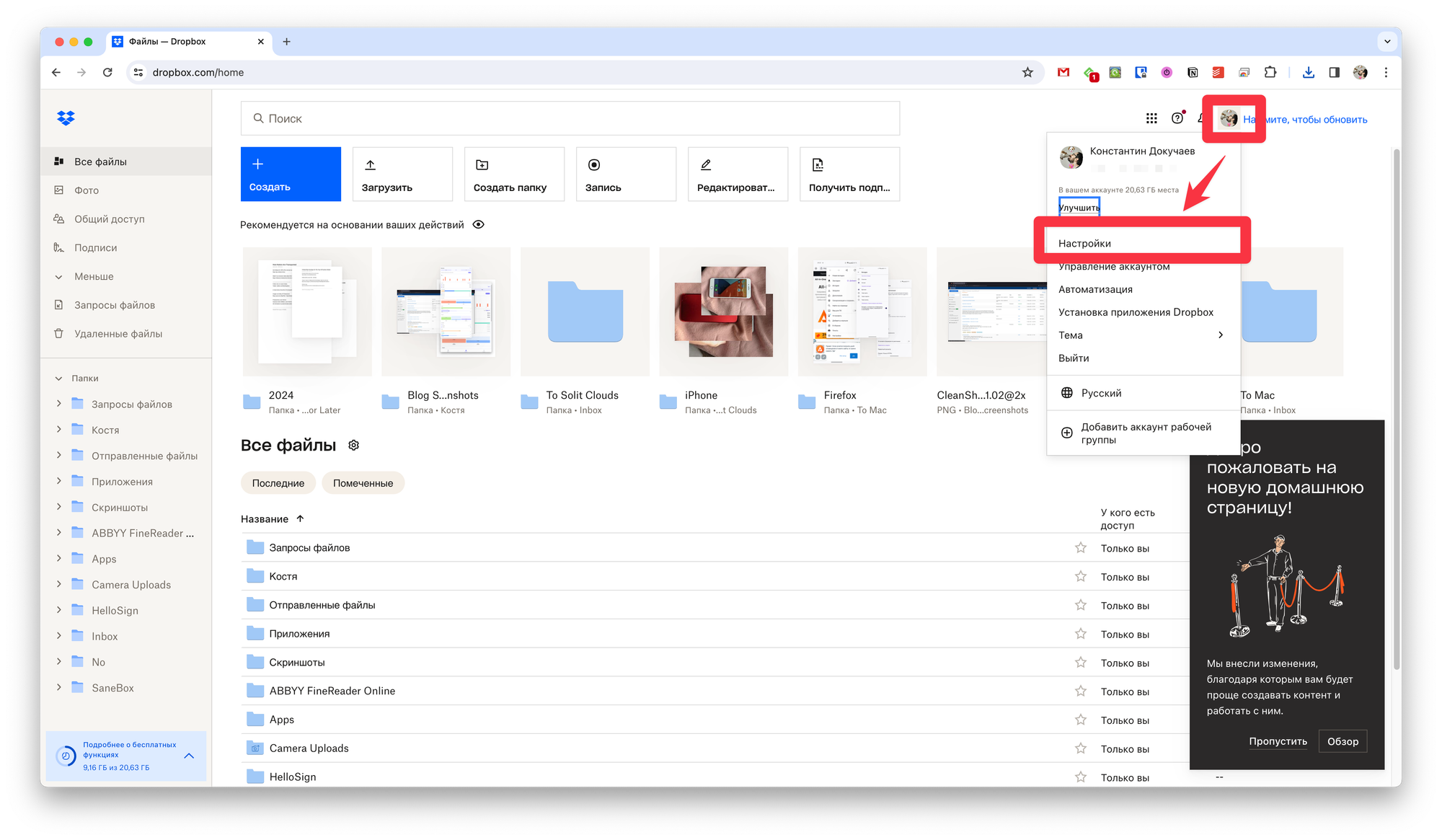 И скажу сразу, что бесплатным пользователям сервиса можно не беспокоиться и закрыть статью. Для нас ИИ не завезли. А вот платникам нужно авторизоваться в браузере в своём аккаунте Dropbox, кликнуть на иконку аккаунта и перейти в раздел настроек.