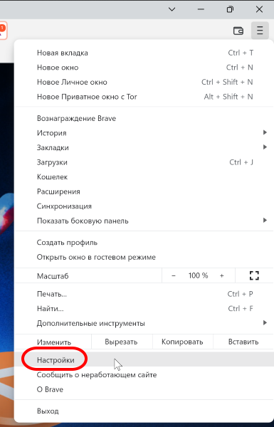 Для этого запустите браузер и в выпадающем меню выберите пункт Настройки. Также можно в адресной строке ввести brave://settings.