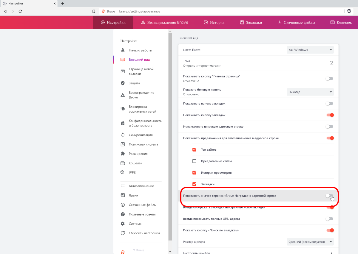 Для этого опять надо перейти в раздел Настройкии в пункт Внешний вид. Отключите пункт Показывать значок сервиса «Brave Награды» в адресной строке.