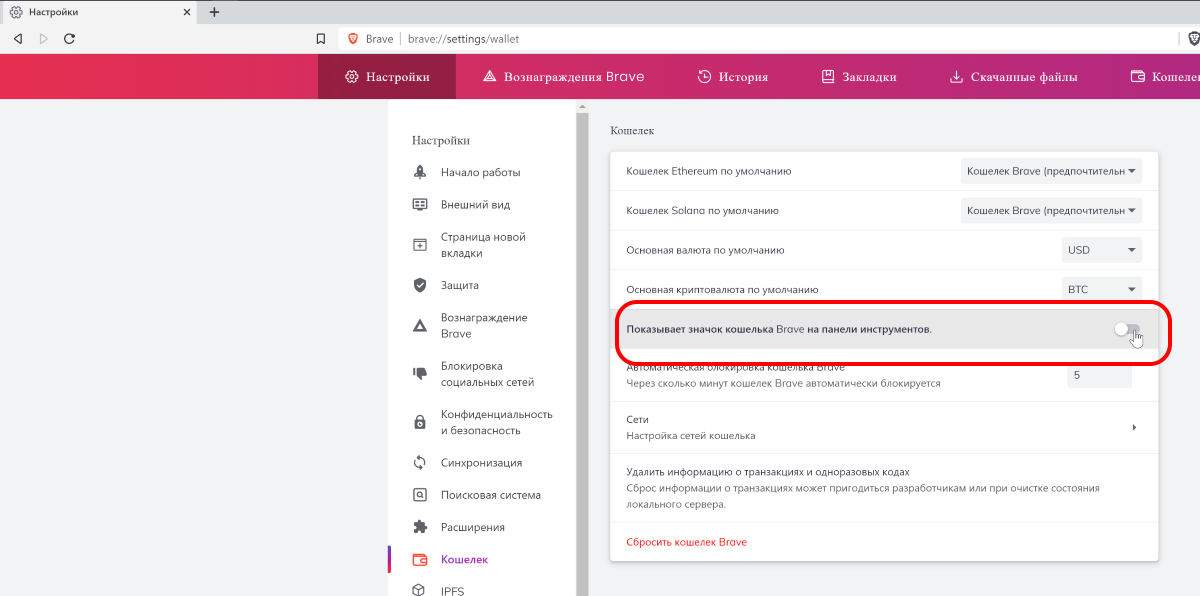 Снова идём в Настройки > Кошелёк. Отключаем опцию Показывать значок кошелька Brave на панели инструментов.