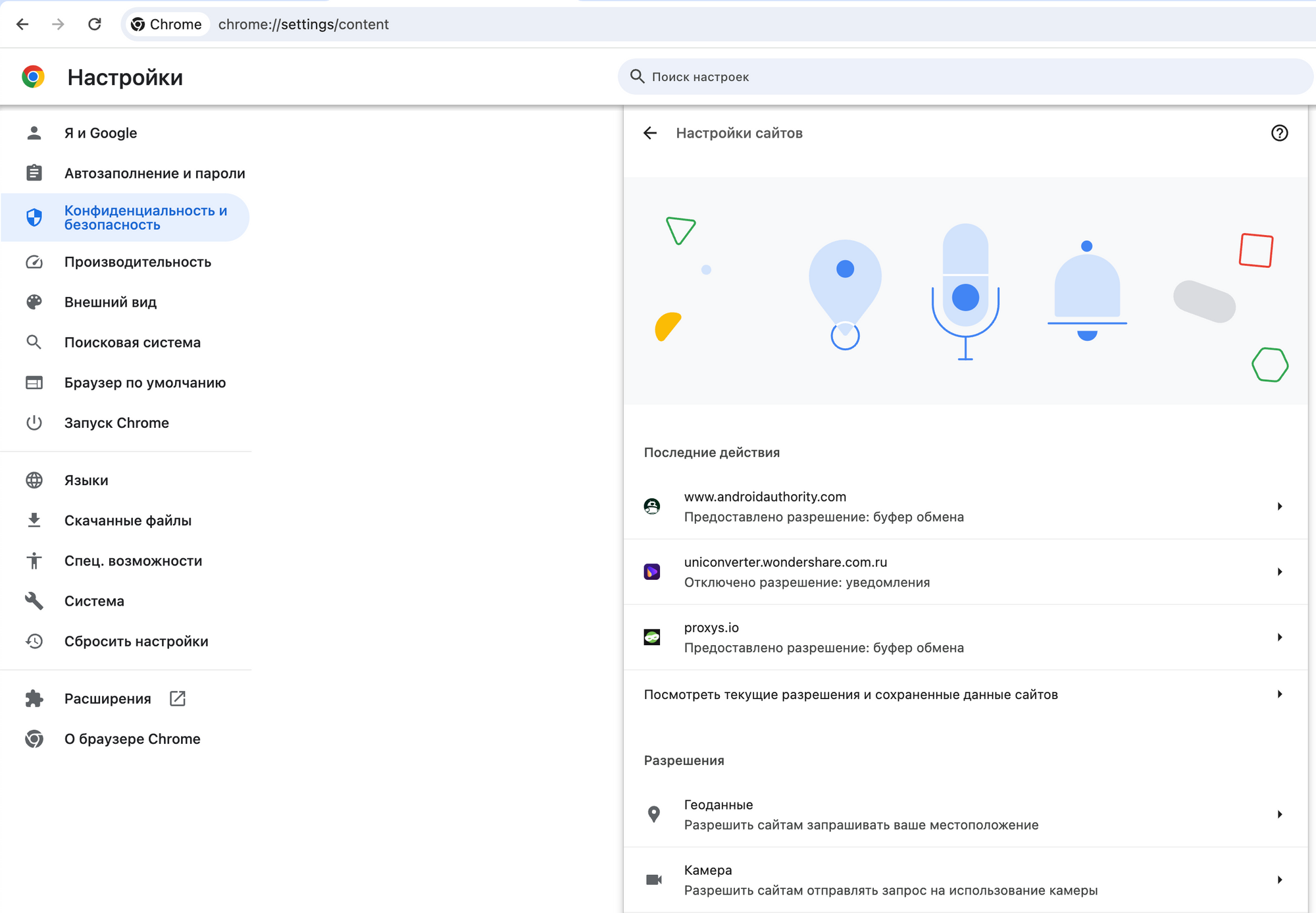 Для управления настройками приватности нужно перейти в соответствующий раздел Настройки > Конфиденциальность и безопасность > Настройки сайтов, либо вставить в адресную строку этот адрес chrome://settings/content и перейти по нему. Здесь вы увидите список разрешений для всех сайтов и приложений.