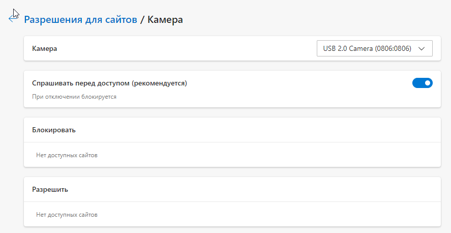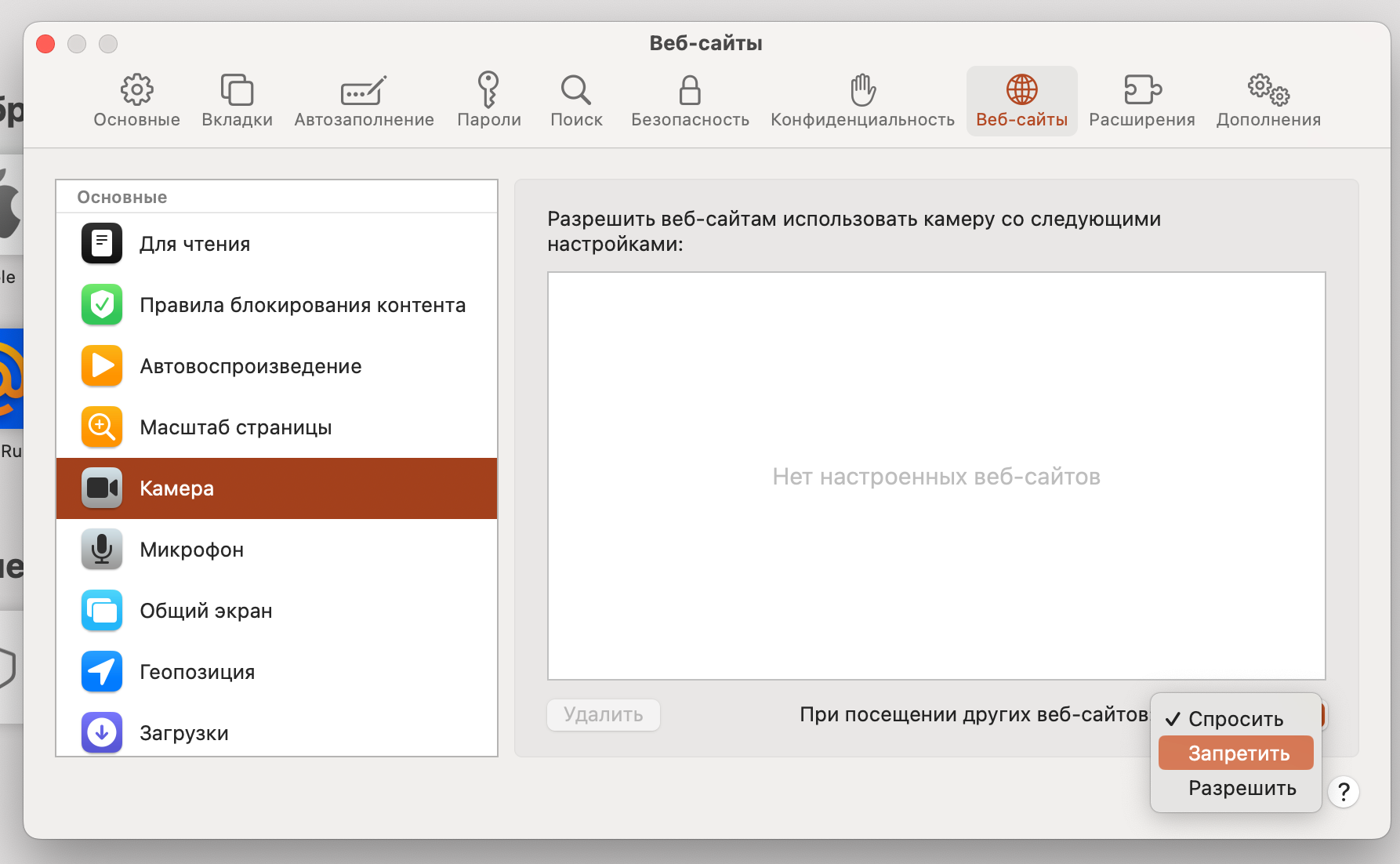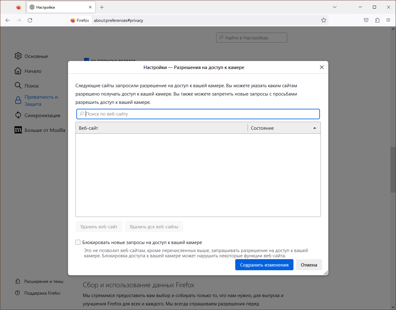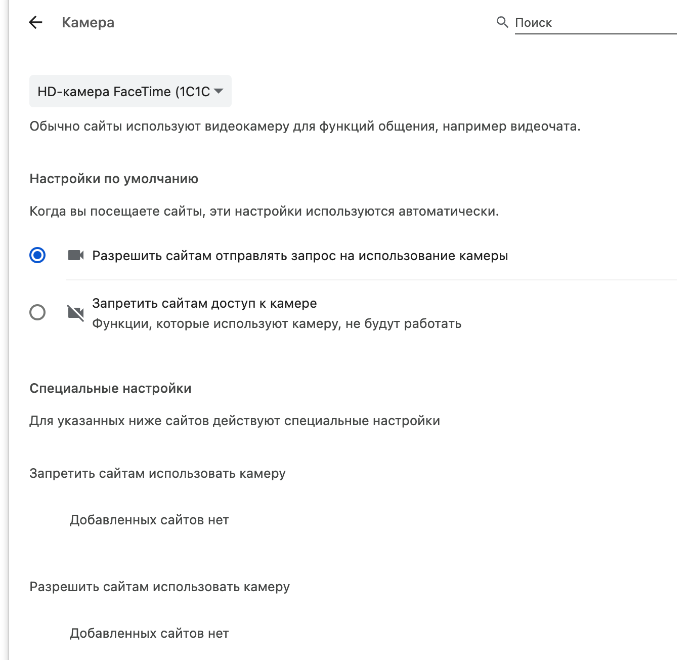 Например, при переходе в Камера можно указать поведение по умолчанию при запросах на доступ к камере: оставить отображение запроса или отключить их навсегда. Также сайты можно вручную добавить в чёрный и белый списки.