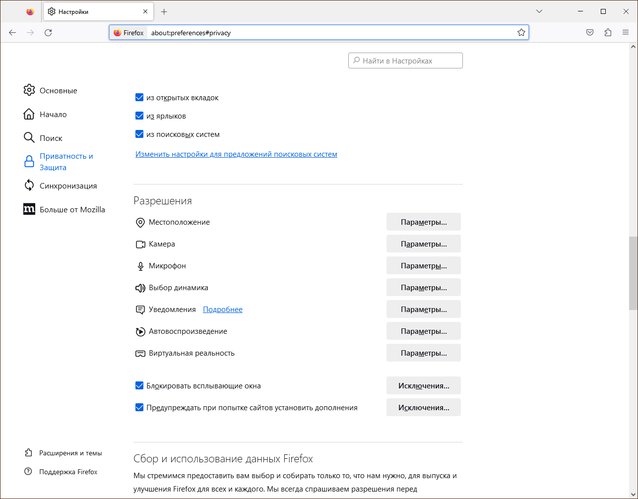 Перейдите в раздел Настройки > Приватность и защита, или просто воспользуйтесь ссылкой about:preferences#privacy. Прокрутите страницу до пункта Разрешения, где вы увидите список всех доступных параметров.